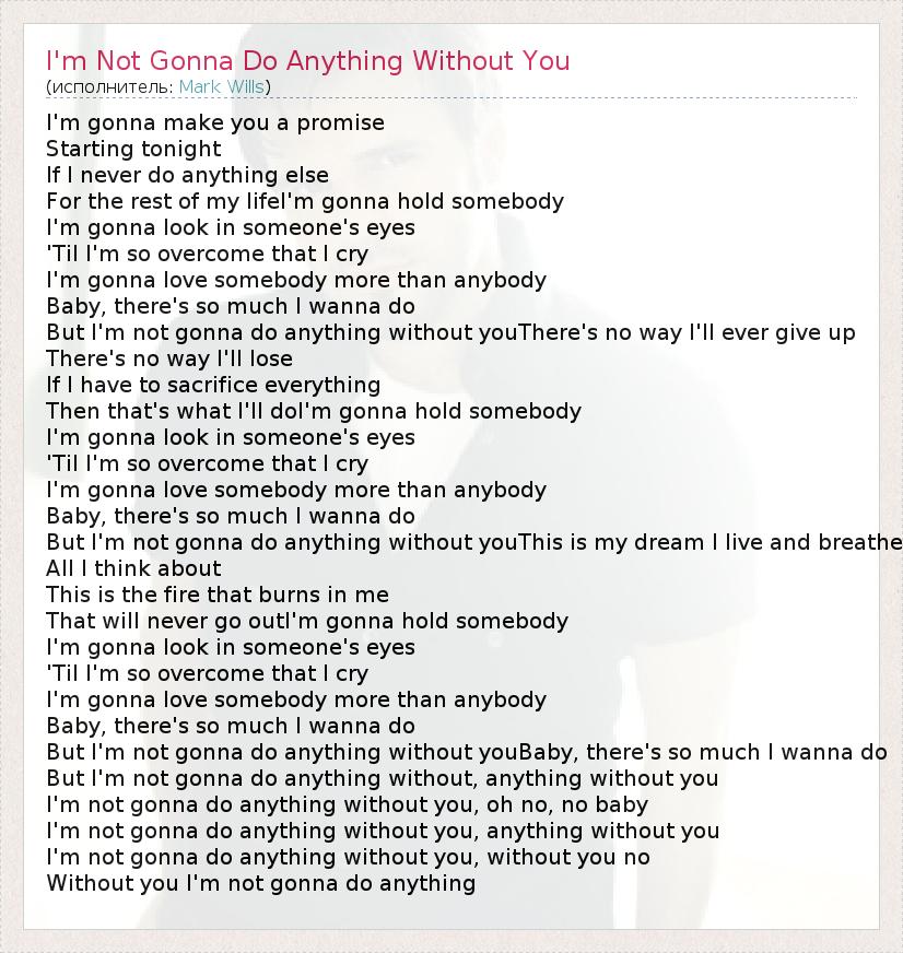 I'm gonna make you a promise Starting tonight If I never do anything else For the rest of my lifeI'm gonna hold somebody I'm gonna look in someone's eyes 'Til I'm so overcome that I cry I'm gonna love somebody more than anybody Baby, there's so much I wanna do But I'm not gonna do anything without youThere's no way I'll ever give up There's no way I'll lose If I have to sacrifice everything Then that's what I'll doI'm gonna hold somebody I'm gonna look in someone's eyes 'Til I'm so overcome that I cry I'm gonna love somebody more than anybody Baby, there's so much I wanna do But I'm not gonna do anything without youThis is my dream I live and breathe All I think about This is the fire that burns in me That will never go outI'm gonna hold somebody I'm gonna look in someone's eyes 'Til I'm so overcome that I cry I'm gonna love somebody more than anybody Baby, there's so much I wanna do But I'm not gonna do anything without youBaby, there's so much I wanna do But I'm not gonna do anything without, anything without you I'm not gonna do anything without you, oh no, no baby I'm not gonna do anything without you, anything without you I'm not gonna do anything without you, without you no Without you I'm not gonna do anything