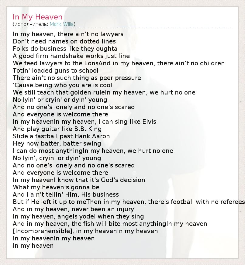 In my heaven, there ain't no lawyers Don't need names on dotted lines Folks do business like they oughta A good firm handshake works just fine We feed lawyers to the lionsAnd in my heaven, there ain't no children Totin' loaded guns to school There ain't no such thing as peer pressure 'Cause being who you are is cool We still teach that golden ruleIn my heaven, we hurt no one No lyin' or cryin' or dyin' young And no one's lonely and no one's scared And everyone is welcome there In my heavenIn my heaven, I can sing like Elvis And play guitar like B.B. King Slide a fastball past Hank Aaron Hey now batter, batter swing I can do most anythingIn my heaven, we hurt no one No lyin', cryin' or dyin' young And no one's lonely and no one's scared And everyone is welcome there In my heavenI know that it's God's decision What my heaven's gonna be And I ain't tellin' Him, His business But if He left it up to meThen in my heaven, there's football with no referees And in my heaven, never been an injury In my heaven, angels yodel when they sing And in my heaven, the fish will bite most anythingIn my heaven [Incomprehensible], in my heavenIn my heaven In my heavenIn my heaven In my heaven
