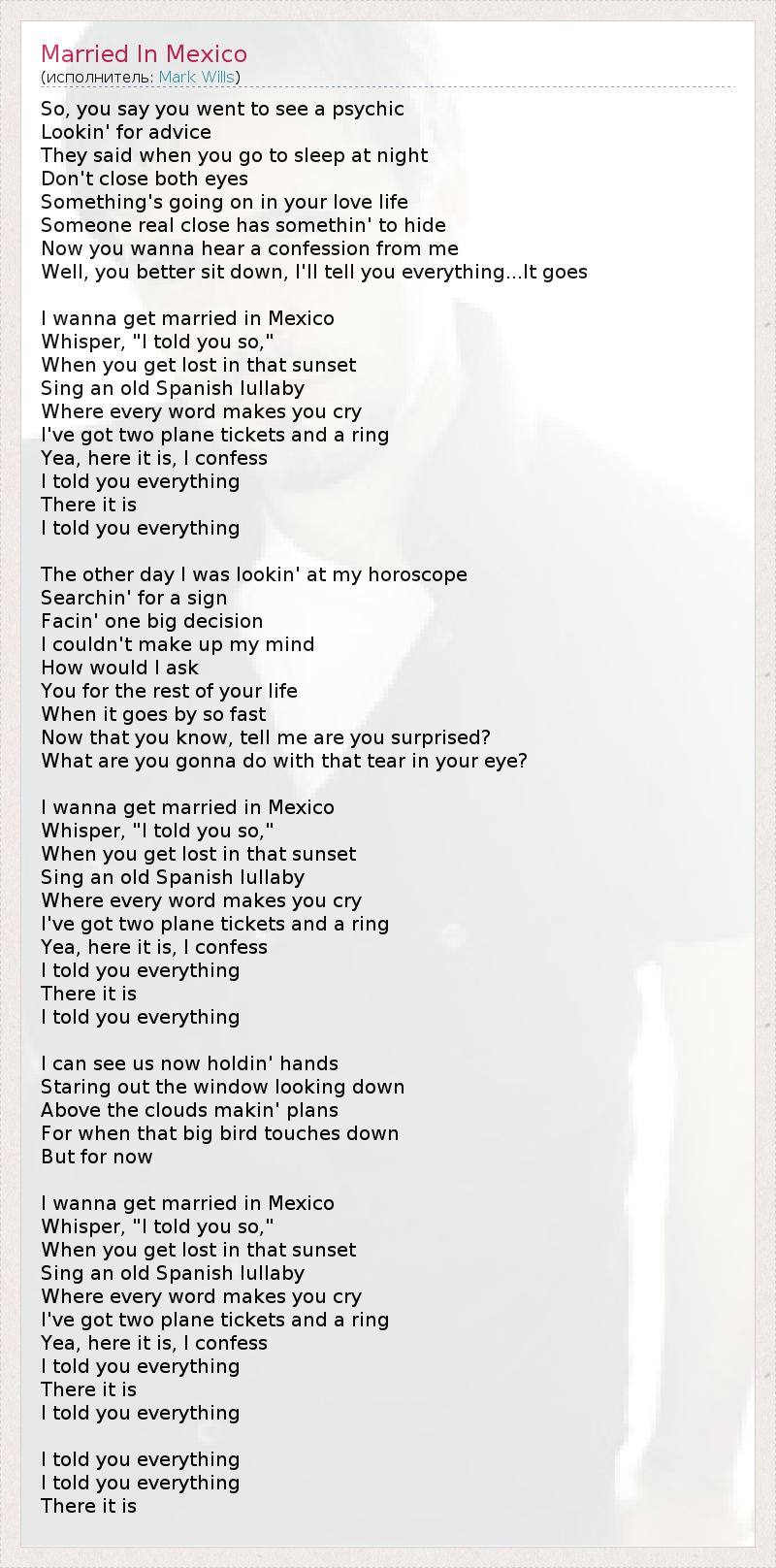 So, you say you went to see a psychic Lookin' for advice They said when you go to sleep at night Don't close both eyes Something's going on in your love life Someone real close has somethin' to hide Now you wanna hear a confession from me Well, you better sit down, I'll tell you everything...It goes I wanna get married in Mexico Whisper, "I told you so," When you get lost in that sunset Sing an old Spanish lullaby Where every word makes you cry I've got two plane tickets and a ring Yea, here it is, I confess I told you everything There it is I told you everything The other day I was lookin' at my horoscope Searchin' for a sign Facin' one big decision I couldn't make up my mind How would I ask You for the rest of your life When it goes by so fast Now that you know, tell me are you surprised? What are you gonna do with that tear in your eye? I wanna get married in Mexico Whisper, "I told you so," When you get lost in that sunset Sing an old Spanish lullaby Where every word makes you cry I've got two plane tickets and a ring Yea, here it is, I confess I told you everything There it is I told you everything I can see us now holdin' hands Staring out the window looking down Above the clouds makin' plans For when that big bird touches down But for now I wanna get married in Mexico Whisper, "I told you so," When you get lost in that sunset Sing an old Spanish lullaby Where every word makes you cry I've got two plane tickets and a ring Yea, here it is, I confess I told you everything There it is I told you everything I told you everything I told you everything There it is
