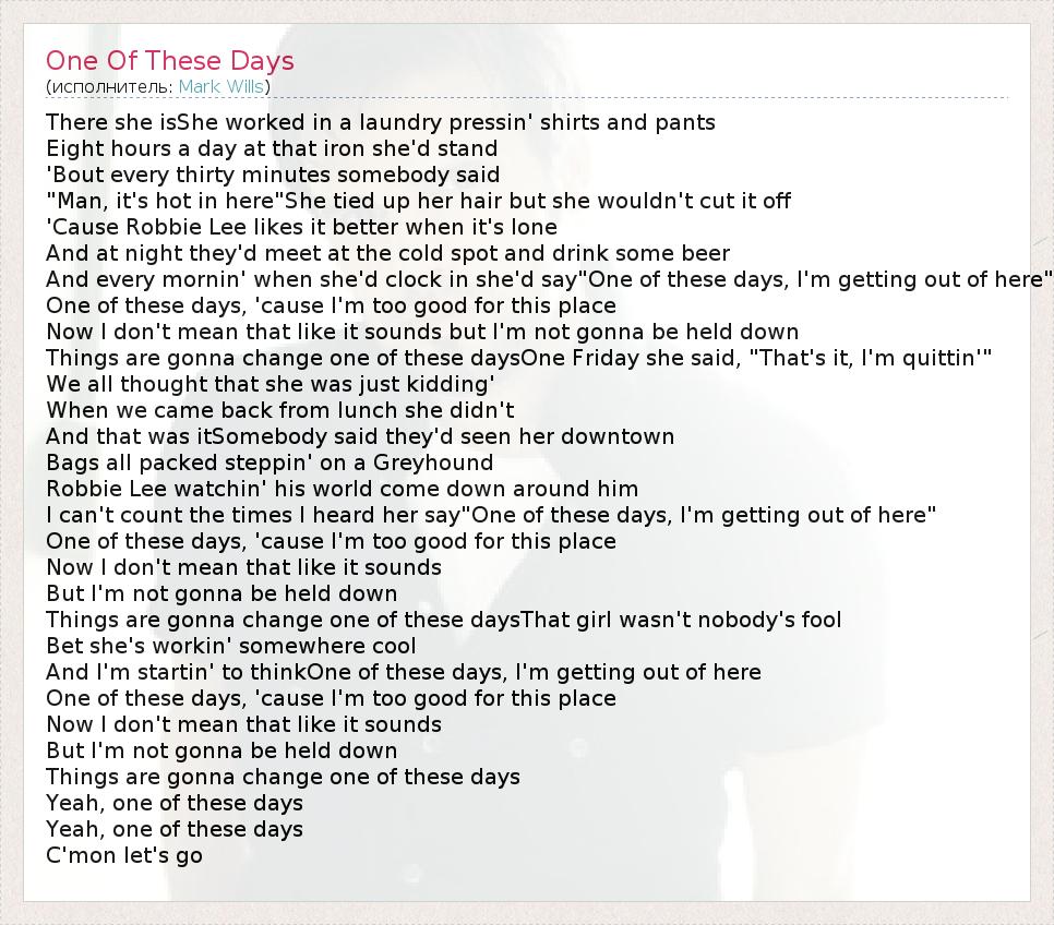 There she isShe worked in a laundry pressin' shirts and pants Eight hours a day at that iron she'd stand 'Bout every thirty minutes somebody said "Man, it's hot in here"She tied up her hair but she wouldn't cut it off 'Cause Robbie Lee likes it better when it's lone And at night they'd meet at the cold spot and drink some beer And every mornin' when she'd clock in she'd say"One of these days, I'm getting out of here" One of these days, 'cause I'm too good for this place Now I don't mean that like it sounds but I'm not gonna be held down Things are gonna change one of these daysOne Friday she said, "That's it, I'm quittin'" We all thought that she was just kidding' When we came back from lunch she didn't And that was itSomebody said they'd seen her downtown Bags all packed steppin' on a Greyhound Robbie Lee watchin' his world come down around him I can't count the times I heard her say"One of these days, I'm getting out of here" One of these days, 'cause I'm too good for this place Now I don't mean that like it sounds But I'm not gonna be held down Things are gonna change one of these daysThat girl wasn't nobody's fool Bet she's workin' somewhere cool And I'm startin' to thinkOne of these days, I'm getting out of here One of these days, 'cause I'm too good for this place Now I don't mean that like it sounds But I'm not gonna be held down Things are gonna change one of these days Yeah, one of these days Yeah, one of these days C'mon let's go