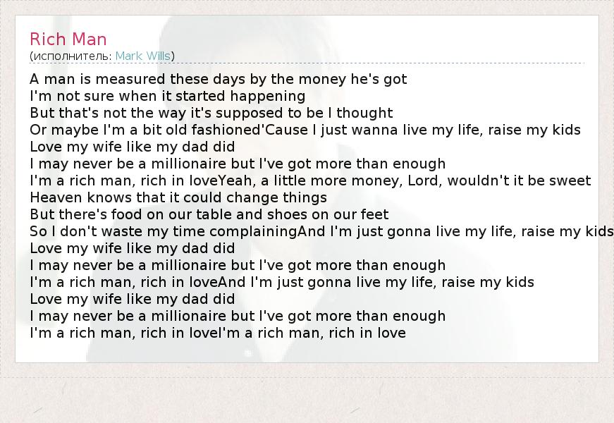 A man is measured these days by the money he's got I'm not sure when it started happening But that's not the way it's supposed to be I thought Or maybe I'm a bit old fashioned'Cause I just wanna live my life, raise my kids Love my wife like my dad did I may never be a millionaire but I've got more than enough I'm a rich man, rich in loveYeah, a little more money, Lord, wouldn't it be sweet Heaven knows that it could change things But there's food on our table and shoes on our feet So I don't waste my time complainingAnd I'm just gonna live my life, raise my kids Love my wife like my dad did I may never be a millionaire but I've got more than enough I'm a rich man, rich in loveAnd I'm just gonna live my life, raise my kids Love my wife like my dad did I may never be a millionaire but I've got more than enough I'm a rich man, rich in loveI'm a rich man, rich in love