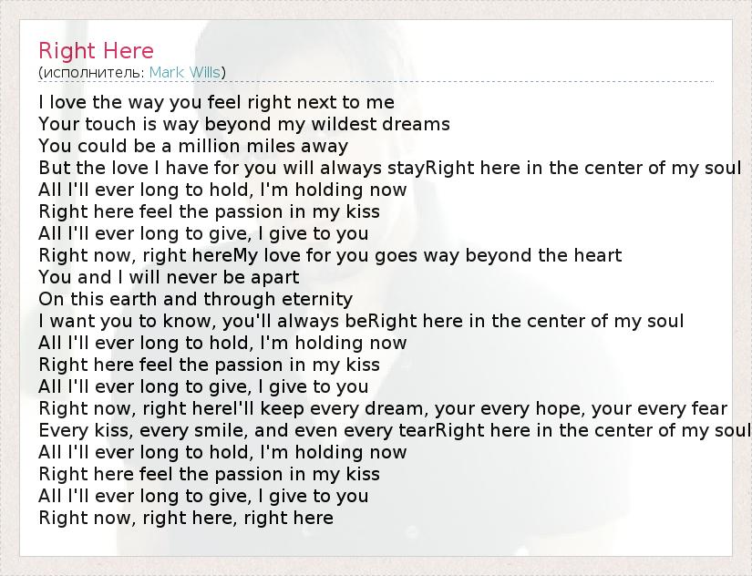 I love the way you feel right next to me Your touch is way beyond my wildest dreams You could be a million miles away But the love I have for you will always stayRight here in the center of my soul All I'll ever long to hold, I'm holding now Right here feel the passion in my kiss All I'll ever long to give, I give to you Right now, right hereMy love for you goes way beyond the heart You and I will never be apart On this earth and through eternity I want you to know, you'll always beRight here in the center of my soul All I'll ever long to hold, I'm holding now Right here feel the passion in my kiss All I'll ever long to give, I give to you Right now, right hereI'll keep every dream, your every hope, your every fear Every kiss, every smile, and even every tearRight here in the center of my soul All I'll ever long to hold, I'm holding now Right here feel the passion in my kiss All I'll ever long to give, I give to you Right now, right here, right here