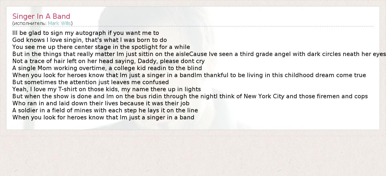 Ill be glad to sign my autograph if you want me to God knows I love singin, that's what I was born to do You see me up there center stage in the spotlight for a while But in the things that really matter Im just sittin on the aisleCause Ive seen a third grade angel with dark circles neath her eyes Not a trace of hair left on her head saying, Daddy, please dont cry A single Mom working overtime, a college kid readin to the blind When you look for heroes know that Im just a singer in a bandIm thankful to be living in this childhood dream come true But sometimes the attention just leaves me confused Yeah, I love my T-shirt on those kids, my name there up in lights But when the show is done and Im on the bus ridin through the nightI think of New York City and those firemen and cops Who ran in and laid down their lives because it was their job A soldier in a field of mines with each step he lays it on the line When you look for heroes know that Im just a singer in a band