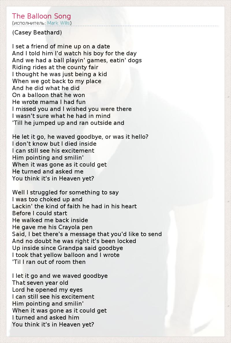 (Casey Beathard) I set a friend of mine up on a date And I told him I'd watch his boy for the day And we had a ball playin' games, eatin' dogs Riding rides at the county fair I thought he was just being a kid When we got back to my place And he did what he did On a balloon that he won He wrote mama I had fun I missed you and I wished you were there I wasn't sure what he had in mind 'Till he jumped up and ran outside and He let it go, he waved goodbye, or was it hello? I don't know but I died inside I can still see his excitement Him pointing and smilin' When it was gone as it could get He turned and asked me You think it's in Heaven yet? Well I struggled for something to say I was too choked up and Lackin' the kind of faith he had in his heart Before I could start He walked me back inside He gave me his Crayola pen Said, I bet there's a message that you'd like to send And no doubt he was right it's been locked Up inside since Grandpa said goodbye I took that yellow balloon and I wrote 'Til I ran out of room then I let it go and we waved goodbye That seven year old Lord he opened my eyes I can still see his excitement Him pointing and smilin' When it was gone as it could get I turned and asked him You think it's in Heaven yet?