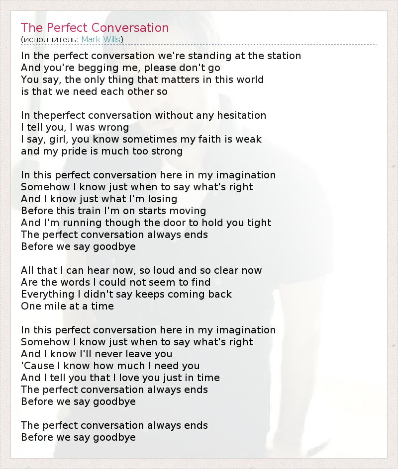 In the perfect conversation we're standing at the station And you're begging me, please don't go You say, the only thing that matters in this world is that we need each other so In theperfect conversation without any hesitation I tell you, I was wrong I say, girl, you know sometimes my faith is weak and my pride is much too strong In this perfect conversation here in my imagination Somehow I know just when to say what's right And I know just what I'm losing Before this train I'm on starts moving And I'm running though the door to hold you tight The perfect conversation always ends Before we say goodbye All that I can hear now, so loud and so clear now Are the words I could not seem to find Everything I didn't say keeps coming back One mile at a time In this perfect conversation here in my imagination Somehow I know just when to say what's right And I know I'll never leave you 'Cause I know how much I need you And I tell you that I love you just in time The perfect conversation always ends Before we say goodbye The perfect conversation always ends Before we say goodbye