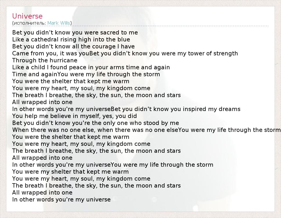 Bet you didn't know you were sacred to me Like a cathedral rising high into the blue Bet you didn't know all the courage I have Came from you, it was youBet you didn't know you were my tower of strength Through the hurricane Like a child I found peace in your arms time and again Time and againYou were my life through the storm You were the shelter that kept me warm You were my heart, my soul, my kingdom come The breath I breathe, the sky, the sun, the moon and stars All wrapped into one In other words you're my universeBet you didn't know you inspired my dreams You help me believe in myself, yes, you did Bet you didn't know you're the only one who stood by me When there was no one else, when there was no one elseYou were my life through the storm You were the shelter that kept me warm You were my heart, my soul, my kingdom come The breath I breathe, the sky, the sun, the moon and stars All wrapped into one In other words you're my universeYou were my life through the storm You were my shelter that kept me warm You were my heart, my soul, my kingdom come The breath I breathe, the sky, the sun, the moon and stars All wrapped into one In other words you're my universe