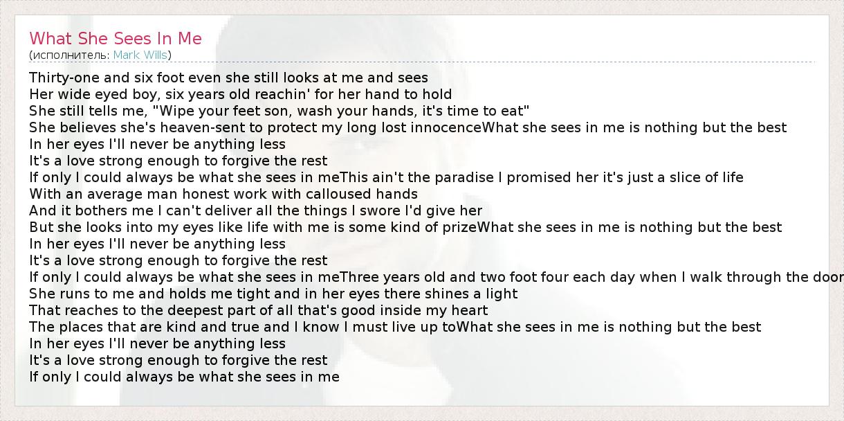 А как ты думаешь, о чем песня "What She Sees In Me" ?