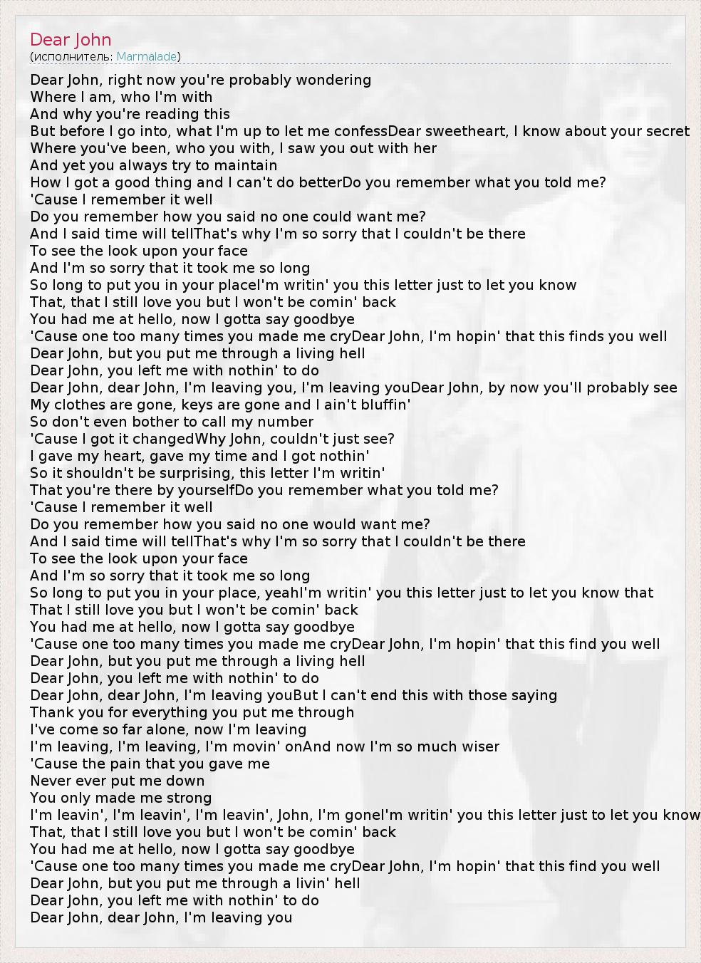 Dear John, right now you're probably wondering Where I am, who I'm with And why you're reading this But before I go into, what I'm up to let me confessDear sweetheart, I know about your secret Where you've been, who you with, I saw you out with her And yet you always try to maintain How I got a good thing and I can't do betterDo you remember what you told me? 'Cause I remember it well Do you remember how you said no one could want me? And I said time will tellThat's why I'm so sorry that I couldn't be there To see the look upon your face And I'm so sorry that it took me so long So long to put you in your placeI'm writin' you this letter just to let you know That, that I still love you but I won't be comin' back You had me at hello, now I gotta say goodbye 'Cause one too many times you made me cryDear John, I'm hopin' that this finds you well Dear John, but you put me through a living hell Dear John, you left me with nothin' to do Dear John, dear John, I'm leaving you, I'm leaving youDear John, by now you'll probably see My clothes are gone, keys are gone and I ain't bluffin' So don't even bother to call my number 'Cause I got it changedWhy John, couldn't just see? I gave my heart, gave my time and I got nothin' So it shouldn't be surprising, this letter I'm writin' That you're there by yourselfDo you remember what you told me? 'Cause I remember it well Do you remember how you said no one would want me? And I said time will tellThat's why I'm so sorry that I couldn't be there To see the look upon your face And I'm so sorry that it took me so long So long to put you in your place, yeahI'm writin' you this letter just to let you know that That I still love you but I won't be comin' back You had me at hello, now I gotta say goodbye 'Cause one too many times you made me cryDear John, I'm hopin' that this find you well Dear John, but you put me through a living hell Dear John, you left me with nothin' to do Dear John, dear John, I'm leaving youBut I can't end this with those saying Thank you for everything you put me through I've come so far alone, now I'm leaving I'm leaving, I'm leaving, I'm movin' onAnd now I'm so much wiser 'Cause the pain that you gave me Never ever put me down You only made me strong I'm leavin', I'm leavin', I'm leavin', John, I'm goneI'm writin' you this letter just to let you know That, that I still love you but I won't be comin' back You had me at hello, now I gotta say goodbye 'Cause one too many times you made me cryDear John, I'm hopin' that this find you well Dear John, but you put me through a livin' hell Dear John, you left me with nothin' to do Dear John, dear John, I'm leaving you