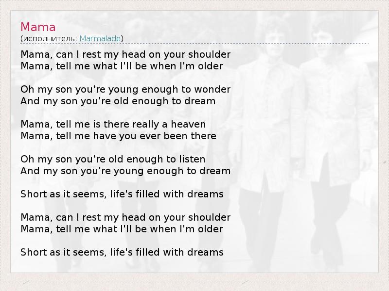 Mama, can I rest my head on your shoulder Mama, tell me what I'll be when I'm older Oh my son you're young enough to wonder And my son you're old enough to dream Mama, tell me is there really a heaven Mama, tell me have you ever been there Oh my son you're old enough to listen And my son you're young enough to dream Short as it seems, life's filled with dreams Mama, can I rest my head on your shoulder Mama, tell me what I'll be when I'm older Short as it seems, life's filled with dreams