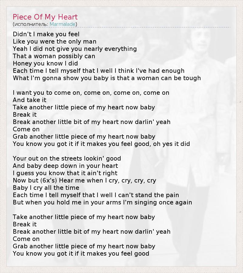 Didn't I make you feel Like you were the only man Yeah I did not give you nearly everything That a woman possibly can Honey you know I did Each time I tell myself that I well I think I've had enough What I'm gonna show you baby is that a woman can be tough I want you to come on, come on, come on, come on And take it Take another little piece of my heart now baby Break it Break another little bit of my heart now darlin' yeah Come on Grab another little piece of my heart now baby You know you got it if it makes you feel good, oh yes it did Your out on the streets lookin' good And baby deep down in your heart I guess you know that it ain't right Now but (6x's) Hear me when I cry, cry, cry, cry Baby I cry all the time Each time I tell myself that I well I can't stand the pain But when you hold me in your arms I'm singing once again Take another little piece of my heart now baby Break it Break another little bit of my heart now darlin' yeah Come on Grab another little piece of my heart now baby You know you got it if it makes you feel good