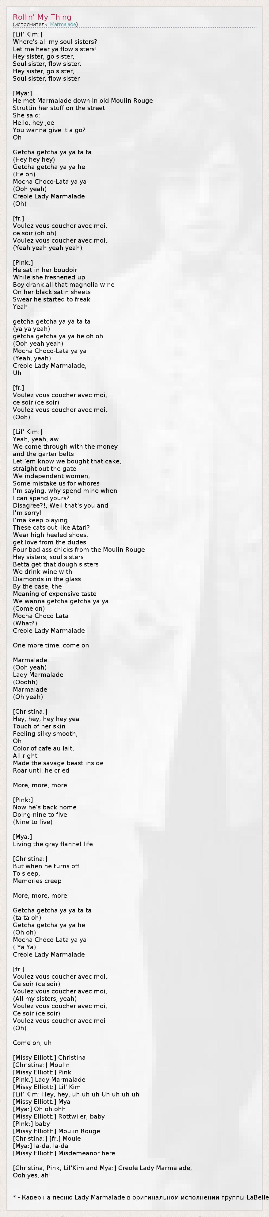 [Lil' Kim:] Where's all my soul sisters? Let me hear ya flow sisters! Hey sister, go sister, Soul sister, flow sister. Hey sister, go sister, Soul sister, flow sister [Mya:] He met Marmalade down in old Moulin Rouge Struttin her stuff on the street She said: Hello, hey Joe You wanna give it a go? Oh Getcha getcha ya ya ta ta (Hey hey hey) Getcha getcha ya ya he (He oh) Mocha Choco-Lata ya ya (Ooh yeah) Creole Lady Marmalade (Oh) [fr.] Voulez vous coucher avec moi, ce soir (oh oh) Voulez vous coucher avec moi, (Yeah yeah yeah yeah) [Pink:] He sat in her boudoir While she freshened up Boy drank all that magnolia wine On her black satin sheets Swear he started to freak Yeah getcha getcha ya ya ta ta (ya ya yeah) getcha getcha ya ya he oh oh (Ooh yeah yeah) Mocha Choco-Lata ya ya (Yeah, yeah) Creole Lady Marmalade, Uh [fr.] Voulez vous coucher avec moi, ce soir (ce soir) Voulez vous coucher avec moi, (Ooh) [Lil' Kim:] Yeah, yeah, aw We come through with the money and the garter belts Let ‘em know we bought that cake, straight out the gate We independent women, Some mistake us for whores I'm saying, why spend mine when I can spend yours? Disagree?!, Well that's you and I'm sorry! I'ma keep playing These cats out like Atari? Wear high heeled shoes, get love from the dudes Four bad ass chicks from the Moulin Rouge Hey sisters, soul sisters Betta get that dough sisters We drink wine with Diamonds in the glass By the case, the Meaning of expensive taste We wanna getcha getcha ya ya (Come on) Mocha Choco Lata (What?) Creole Lady Marmalade One more time, come on Marmalade (Ooh yeah) Lady Marmalade (Ooohh) Marmalade (Oh yeah) [Christina:] Hey, hey, hey hey yea Touch of her skin Feeling silky smooth, Oh Color of cafe au lait, All right Made the savage beast inside Roar until he cried More, more, more [Pink:] Now he's back home Doing nine to five (Nine to five) [Mya:] Living the gray flannel life [Christina:] But when he turns off To sleep, Memories creep More, more, more Getcha getcha ya ya ta ta (ta ta oh) Getcha getcha ya ya he (Oh oh) Mocha Choco-Lata ya ya ( Ya Ya) Creole Lady Marmalade [fr.] Voulez vous coucher avec moi, Ce soir (ce soir) Voulez vous coucher avec moi, (All my sisters, yeah) Voulez vous coucher avec moi, Ce soir (ce soir) Voulez vous coucher avec moi (Oh) Come on, uh [Missy Elliott:] Christina [Christina:] Moulin [Missy Elliott:] Pink [Pink:] Lady Marmalade [Missy Elliott:] Lil' Kim [Lil' Kim: Hey, hey, uh uh uh Uh uh uh uh [Missy Elliott:] Mya [Mya:] Oh oh ohh [Missy Elliott:] Rottwiler, baby [Pink:] baby [Missy Elliott:] Moulin Rouge [Christina:] [fr.] Moule [Mya:] la-da, la-da [Missy Elliott:] Misdemeanor here [Christina, Pink, Lil'Kim and Mya:] Creole Lady Marmalade, Ooh yes, ah! * - Кавер на песню Lady Marmalade в оригинальном исполнении группы LaBelle