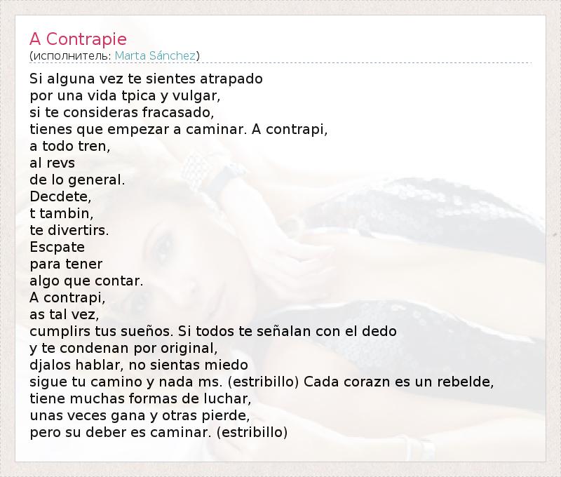 Si alguna vez te sientes atrapado por una vida tpica y vulgar, si te consideras fracasado, tienes que empezar a caminar. A contrapi, a todo tren, al revs de lo general. Decdete, t tambin, te divertirs. Escpate para tener algo que contar. A contrapi, as tal vez, cumplirs tus sueños. Si todos te señalan con el dedo y te condenan por original, djalos hablar, no sientas miedo sigue tu camino y nada ms. (estribillo) Cada corazn es un rebelde, tiene muchas formas de luchar, unas veces gana y otras pierde, pero su deber es caminar. (estribillo)
