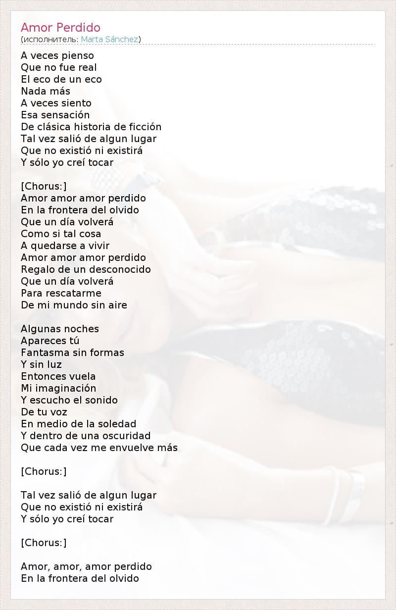 Иногда я думаю, Что это не было реально: Эхо от эха, Больше ничего. Иногда у меня появляется Это чувство Классической придуманной истории. Возможно, он пришёл из какого-то места, Где не существовал и даже не будет существовать, И только я поверила в прикосновение. [Припев:] Любовь, любовь, потерянная любовь На грани забвения, Её день вернёт Как обычно, Чтобы оставаться, чтобы жить. Любовь, любовь, потерянная любовь - Подарок незнакомца, Её день вернёт, Чтобы вызволить меня Из моего мира без воздуха. В некоторые из ночей Появляешься ты - Призрак без форм - И без света, Тогда парит Моё воображение И я слушаю звук Твоего голоса Среди одиночества И в темноте, Которое каждый раз окутывает меня всё больше. [Припев:] Возможно, он пришёл из какого-то места, Где не существовал и даже не будет существовать, И только я поверила в прикосновение. [Припев:] Любовь, любовь, потерянная любовь На грани забвения...
