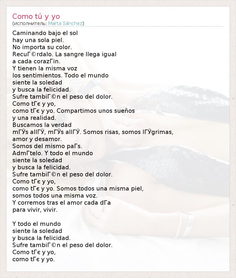 Caminando bajo el sol hay una sola piel. No importa su color. RecuГ©rdalo. La sangre llega igual a cada corazГіn. Y tienen la misma voz los sentimientos. Todo el mundo siente la soledad y busca la felicidad. Sufre tambiГ©n el peso del dolor. Como tГє y yo, como tГє y yo. Compartimos unos sueños y una realidad. Buscamos la verdad mГЎs allГЎ, mГЎs allГЎ. Somos risas, somos lГЎgrimas, amor y desamor. Somos del mismo paГs. AdmГtelo. Y todo el mundo siente la soledad y busca la felicidad. Sufre tambiГ©n el peso del dolor. Como tГє y yo, como tГє y yo. Somos todos una misma piel, somos todos una misma voz. Y corremos tras el amor cada dГa para vivir, vivir. Y todo el mundo siente la soledad y busca la felicidad. Sufre tambiГ©n el peso del dolor. Como tГє y yo, como tГє y yo.