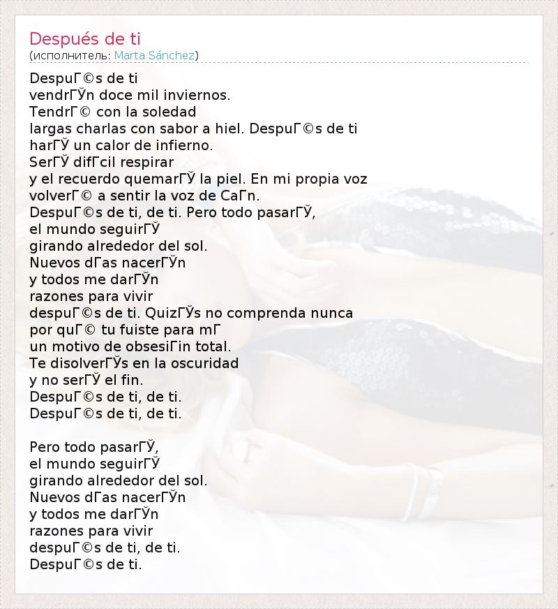 DespuГ©s de ti vendrГЎn doce mil inviernos. TendrГ© con la soledad largas charlas con sabor a hiel. DespuГ©s de ti harГЎ un calor de infierno. SerГЎ difГcil respirar y el recuerdo quemarГЎ la piel. En mi propia voz volverГ© a sentir la voz de CaГn. DespuГ©s de ti, de ti. Pero todo pasarГЎ, el mundo seguirГЎ girando alrededor del sol. Nuevos dГas nacerГЎn y todos me darГЎn razones para vivir despuГ©s de ti. QuizГЎs no comprenda nunca por quГ© tu fuiste para mГ un motivo de obsesiГіn total. Te disolverГЎs en la oscuridad y no serГЎ el fin. DespuГ©s de ti, de ti. DespuГ©s de ti, de ti. Pero todo pasarГЎ, el mundo seguirГЎ girando alrededor del sol. Nuevos dГas nacerГЎn y todos me darГЎn razones para vivir despuГ©s de ti, de ti. DespuГ©s de ti.