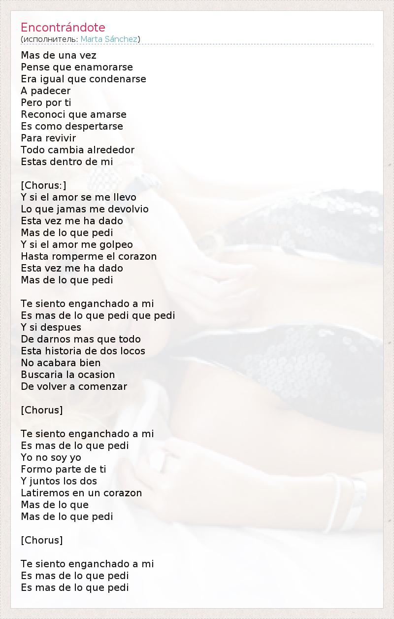 Mas de una vez Pense que enamorarse Era igual que condenarse A padecer Pero por ti Reconoci que amarse Es como despertarse Para revivir Todo cambia alrededor Estas dentro de mi [Chorus:] Y si el amor se me llevo Lo que jamas me devolvio Esta vez me ha dado Mas de lo que pedi Y si el amor me golpeo Hasta romperme el corazon Esta vez me ha dado Mas de lo que pedi Te siento enganchado a mi Es mas de lo que pedi que pedi Y si despues De darnos mas que todo Esta historia de dos locos No acabara bien Buscaria la ocasion De volver a comenzar [Chorus] Te siento enganchado a mi Es mas de lo que pedi Yo no soy yo Formo parte de ti Y juntos los dos Latiremos en un corazon Mas de lo que Mas de lo que pedi [Chorus] Te siento enganchado a mi Es mas de lo que pedi Es mas de lo que pedi