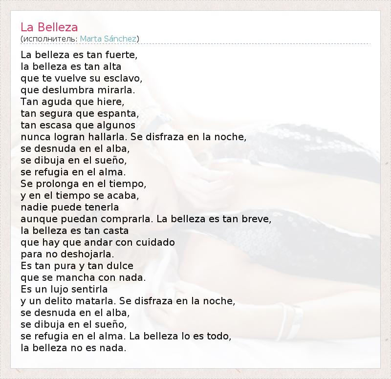 La belleza es tan fuerte, la belleza es tan alta que te vuelve su esclavo, que deslumbra mirarla. Tan aguda que hiere, tan segura que espanta, tan escasa que algunos nunca logran hallarla. Se disfraza en la noche, se desnuda en el alba, se dibuja en el sueño, se refugia en el alma. Se prolonga en el tiempo, y en el tiempo se acaba, nadie puede tenerla aunque puedan comprarla. La belleza es tan breve, la belleza es tan casta que hay que andar con cuidado para no deshojarla. Es tan pura y tan dulce que se mancha con nada. Es un lujo sentirla y un delito matarla. Se disfraza en la noche, se desnuda en el alba, se dibuja en el sueño, se refugia en el alma. La belleza lo es todo, la belleza no es nada.