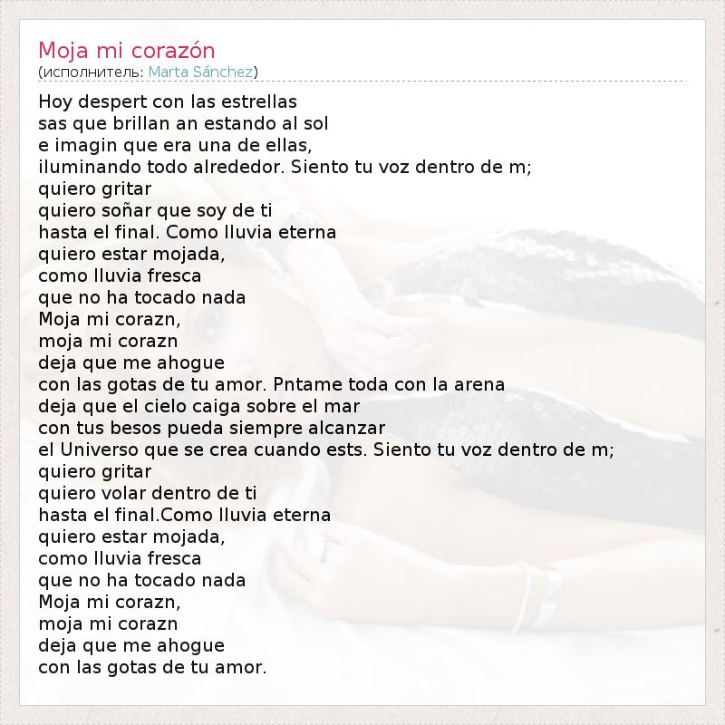 Hoy despert con las estrellas sas que brillan an estando al sol e imagin que era una de ellas, iluminando todo alrededor. Siento tu voz dentro de m; quiero gritar quiero soñar que soy de ti hasta el final. Como lluvia eterna quiero estar mojada, como lluvia fresca que no ha tocado nada Moja mi corazn, moja mi corazn deja que me ahogue con las gotas de tu amor. Pntame toda con la arena deja que el cielo caiga sobre el mar con tus besos pueda siempre alcanzar el Universo que se crea cuando ests. Siento tu voz dentro de m; quiero gritar quiero volar dentro de ti hasta el final.Como lluvia eterna quiero estar mojada, como lluvia fresca que no ha tocado nada Moja mi corazn, moja mi corazn deja que me ahogue con las gotas de tu amor.