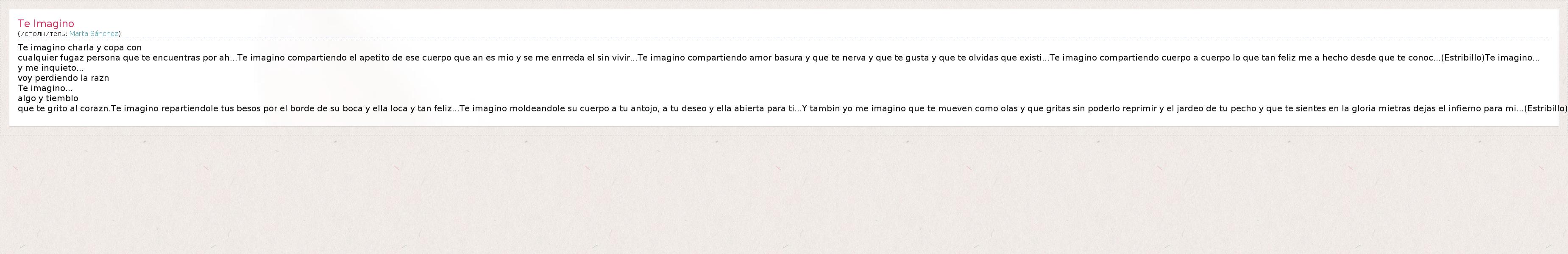 cualquier fugaz persona que te encuentras por ah...Te imagino compartiendo el apetito de ese cuerpo que an es mio y se me enrreda el sin vivir...Te imagino compartiendo amor basura y que te nerva y que te gusta y que te olvidas que existi...Te imagino compartiendo cuerpo a cuerpo lo que tan feliz me a hecho desde que te conoc...(Estribillo)Te imagino...