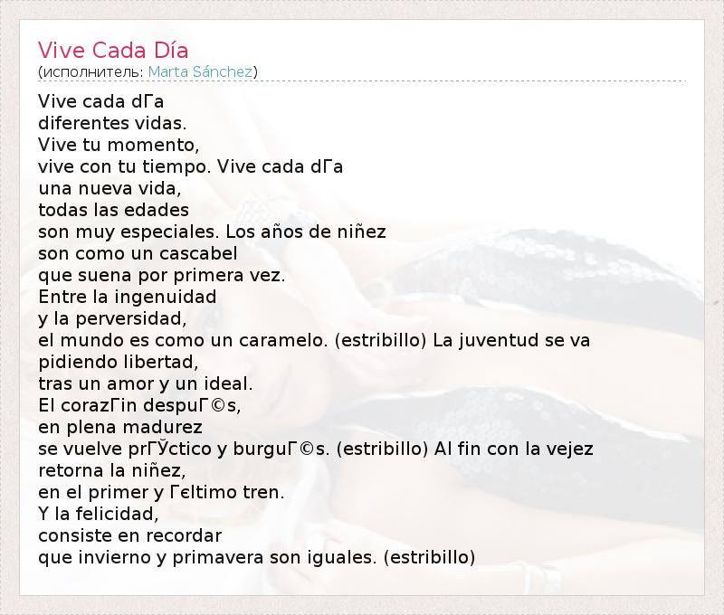 Vive cada dГa diferentes vidas. Vive tu momento, vive con tu tiempo. Vive cada dГa una nueva vida, todas las edades son muy especiales. Los años de niñez son como un cascabel que suena por primera vez. Entre la ingenuidad y la perversidad, el mundo es como un caramelo. (estribillo) La juventud se va pidiendo libertad, tras un amor y un ideal. El corazГіn despuГ©s, en plena madurez se vuelve prГЎctico y burguГ©s. (estribillo) Al fin con la vejez retorna la niñez, en el primer y Гєltimo tren. Y la felicidad, consiste en recordar que invierno y primavera son iguales. (estribillo)