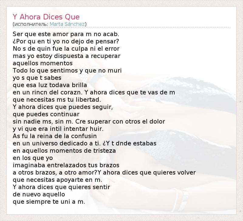 Ser que este amor para m no acab. ¿Por qu en ti yo no dejo de pensar? No s de quin fue la culpa ni el error mas yo estoy dispuesta a recuperar aquellos momentos Todo lo que sentimos y que no muri yo s que t sabes que esa luz todava brilla en un rincn del corazn. Y ahora dices que te vas de m que necesitas ms tu libertad. Y ahora dices que puedes seguir, que puedes continuar sin nadie ms, sin m. Cre superar con otros el dolor y vi que era intil intentar huir. As fu la reina de la confusin en un universo dedicado a ti. ¿Y t dnde estabas en aquellos momentos de tristeza en los que yo imaginaba entrelazados tus brazos a otros brazos, a otro amor?Y ahora dices que quieres volver que necesitas apoyarte en m. Y ahora dices que quieres sentir de nuevo aquello que siempre te uni a m.