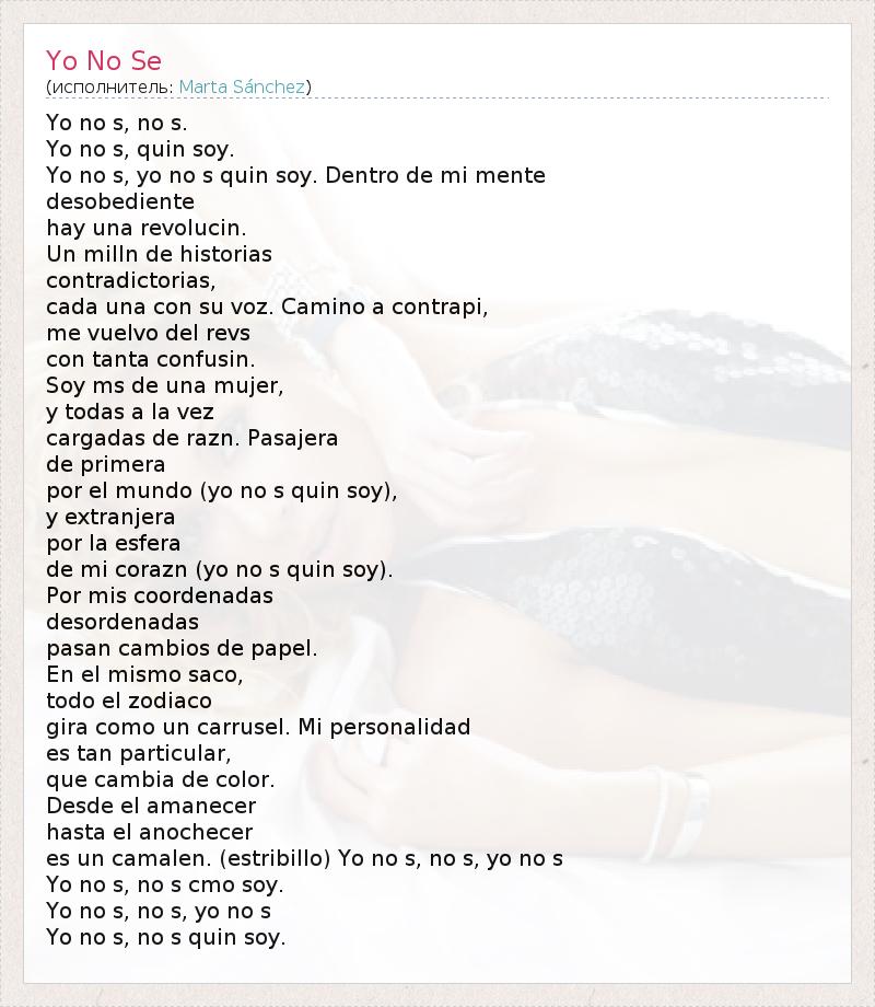 Yo no s, no s. Yo no s, quin soy. Yo no s, yo no s quin soy. Dentro de mi mente desobediente hay una revolucin. Un milln de historias contradictorias, cada una con su voz. Camino a contrapi, me vuelvo del revs con tanta confusin. Soy ms de una mujer, y todas a la vez cargadas de razn. Pasajera de primera por el mundo (yo no s quin soy), y extranjera por la esfera de mi corazn (yo no s quin soy). Por mis coordenadas desordenadas pasan cambios de papel. En el mismo saco, todo el zodiaco gira como un carrusel. Mi personalidad es tan particular, que cambia de color. Desde el amanecer hasta el anochecer es un camalen. (estribillo) Yo no s, no s, yo no s Yo no s, no s cmo soy. Yo no s, no s, yo no s Yo no s, no s quin soy.