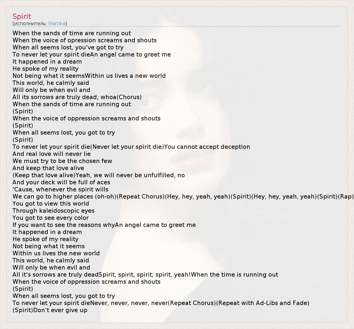 When the sands of time are running out When the voice of opression screams and shouts When all seems lost, you've got to try To never let your spirit dieAn angel came to greet me It happened in a dream He spoke of my reality Not being what it seemsWithin us lives a new world This world, he calmly said Will only be when evil and All its sorrows are truly dead, whoa(Chorus) When the sands of time are running out (Spirit) When the voice of oppression screams and shouts (Spirit) When all seems lost, you got to try (Spirit) To never let your spirit die(Never let your spirit die)You cannot accept deception And real love will never lie We must try to be the chosen few And keep that love alive (Keep that love alive)Yeah, we will never be unfulfilled, no And your deck will be full of aces 'Cause, whenever the spirit wills We can go to higher places (oh-oh)(Repeat Chorus)(Hey, hey, yeah, yeah)(Spirit)(Hey, hey, yeah, yeah)(Spirit)(Rap) You got to view this world Through kaleidoscopic eyes You got to see every color If you want to see the reasons whyAn angel came to greet me It happened in a dream He spoke of my reality Not being what it seems Within us lives the new world This world, he calmly said Will only be when evil and All it's sorrows are truly deadSpirit, spirit, spirit, spirit, yeah!When the time is running out When the voice of oppression screams and shouts (Spirit) When all seems lost, you got to try To never let your spirit dieNever, never, never, never(Repeat Chorus)(Repeat with Ad-Libs and Fade) (Spirit)Don't ever give up