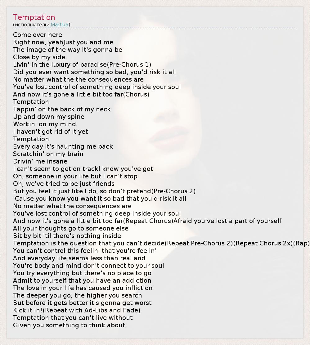 Come over here Right now, yeahJust you and me The image of the way it's gonna be Close by my side Livin' in the luxury of paradise(Pre-Chorus 1) Did you ever want something so bad, you'd risk it all No matter what the the consequences are You've lost control of something deep inside your soul And now it's gone a little bit too far(Chorus) Temptation Tappin' on the back of my neck Up and down my spine Workin' on my mind I haven't got rid of it yet Temptation Every day it's haunting me back Scratchin' on my brain Drivin' me insane I can't seem to get on trackI know you've got Oh, someone in your life but I can't stop Oh, we've tried to be just friends But you feel it just like I do, so don't pretend(Pre-Chorus 2) 'Cause you know you want it so bad that you'd risk it all No matter what the consequences are You've lost control of something deep inside your soul And now it's gone a little bit too far(Repeat Chorus)Afraid you've lost a part of yourself All your thoughts go to someone else Bit by bit 'til there's nothing inside Temptation is the question that you can't decide(Repeat Pre-Chorus 2)(Repeat Chorus 2x)(Rap) You can't control this feelin' that you're feelin' And everyday life seems less than real and You're body and mind don't connect to your soul You try everything but there's no place to go Admit to yourself that you have an addiction The love in your life has caused you infliction The deeper you go, the higher you search But before it gets better it's gonna get worst Kick it in!(Repeat with Ad-Libs and Fade) Temptation that you can't live without Given you something to think about