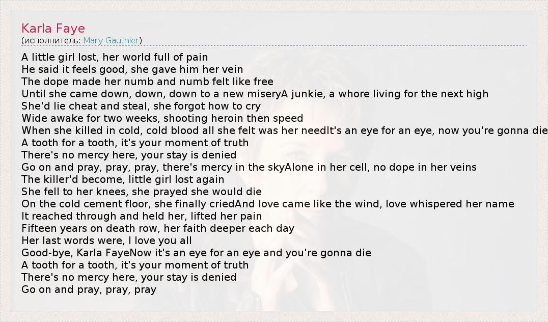 A little girl lost, her world full of pain He said it feels good, she gave him her vein The dope made her numb and numb felt like free Until she came down, down, down to a new miseryA junkie, a whore living for the next high She'd lie cheat and steal, she forgot how to cry Wide awake for two weeks, shooting heroin then speed When she killed in cold, cold blood all she felt was her needIt's an eye for an eye, now you're gonna die A tooth for a tooth, it's your moment of truth There's no mercy here, your stay is denied Go on and pray, pray, pray, there's mercy in the skyAlone in her cell, no dope in her veins The killer'd become, little girl lost again She fell to her knees, she prayed she would die On the cold cement floor, she finally criedAnd love came like the wind, love whispered her name It reached through and held her, lifted her pain Fifteen years on death row, her faith deeper each day Her last words were, I love you all Good-bye, Karla FayeNow it's an eye for an eye and you're gonna die A tooth for a tooth, it's your moment of truth There's no mercy here, your stay is denied Go on and pray, pray, pray