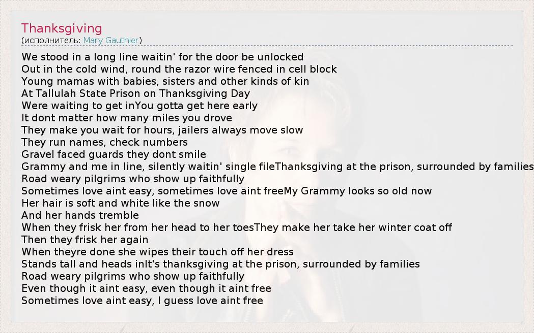 We stood in a long line waitin' for the door be unlocked Out in the cold wind, round the razor wire fenced in cell block Young mamas with babies, sisters and other kinds of kin At Tallulah State Prison on Thanksgiving Day Were waiting to get inYou gotta get here early It dont matter how many miles you drove They make you wait for hours, jailers always move slow They run names, check numbers Gravel faced guards they dont smile Grammy and me in line, silently waitin' single fileThanksgiving at the prison, surrounded by families Road weary pilgrims who show up faithfully Sometimes love aint easy, sometimes love aint freeMy Grammy looks so old now Her hair is soft and white like the snow And her hands tremble When they frisk her from her head to her toesThey make her take her winter coat off Then they frisk her again When theyre done she wipes their touch off her dress Stands tall and heads inIt's thanksgiving at the prison, surrounded by families Road weary pilgrims who show up faithfully Even though it aint easy, even though it aint free Sometimes love aint easy, I guess love aint free