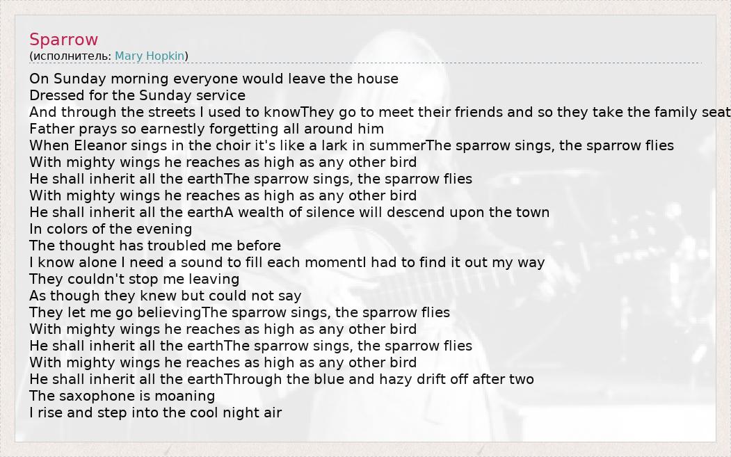 When Eleanor sings in the choir it's like a lark in summerThe sparrow sings, the sparrow flies