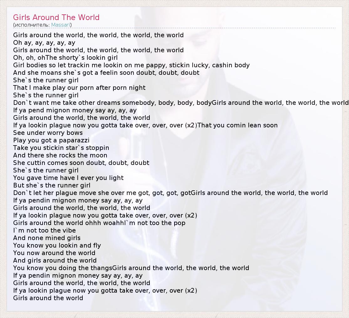 Girls around the world, the world, the world, the world Oh ay, ay, ay, ay, ay Girls around the world, the world, the world, the world Oh, oh, ohThe shorty`s lookin girl Girl bodies so let trackin me lookin on me pappy, stickin lucky, cashin body And she moans she`s got a feelin soon doubt, doubt, doubt She`s the runner girl That I make play our porn after porn night She`s the runner girl Don`t want me take other dreams somebody, body, body, bodyGirls around the world, the world, the world If ya pend mignon money say ay, ay, ay Girls around the world, the world, the world If ya lookin plague now you gotta take over, over, over (x2)That you comin lean soon See under worry bows Play you got a paparazzi Take you stickin star`s stoppin And there she rocks the moon She cuttin comes soon doubt, doubt, doubt She`s the runner girl You gave time have I ever you light But she`s the runner girl Don`t let her plague move she over me got, got, got, gotGirls around the world, the world, the world If ya pendin mignon money say ay, ay, ay Girls around the world, the world, the world If ya lookin plague now you gotta take over, over, over (x2) Girls around the world ohhh woahhI`m not too the pop I`m not too the vibe And none mined girls You know you lookin and fly You now around the world And girls around the world You know you doing the thangsGirls around the world, the world, the world If ya pendin mignon money say ay, ay, ay Girls around the world, the world, the world If ya lookin plague now you gotta take over, over, over (x2) Girls around the world