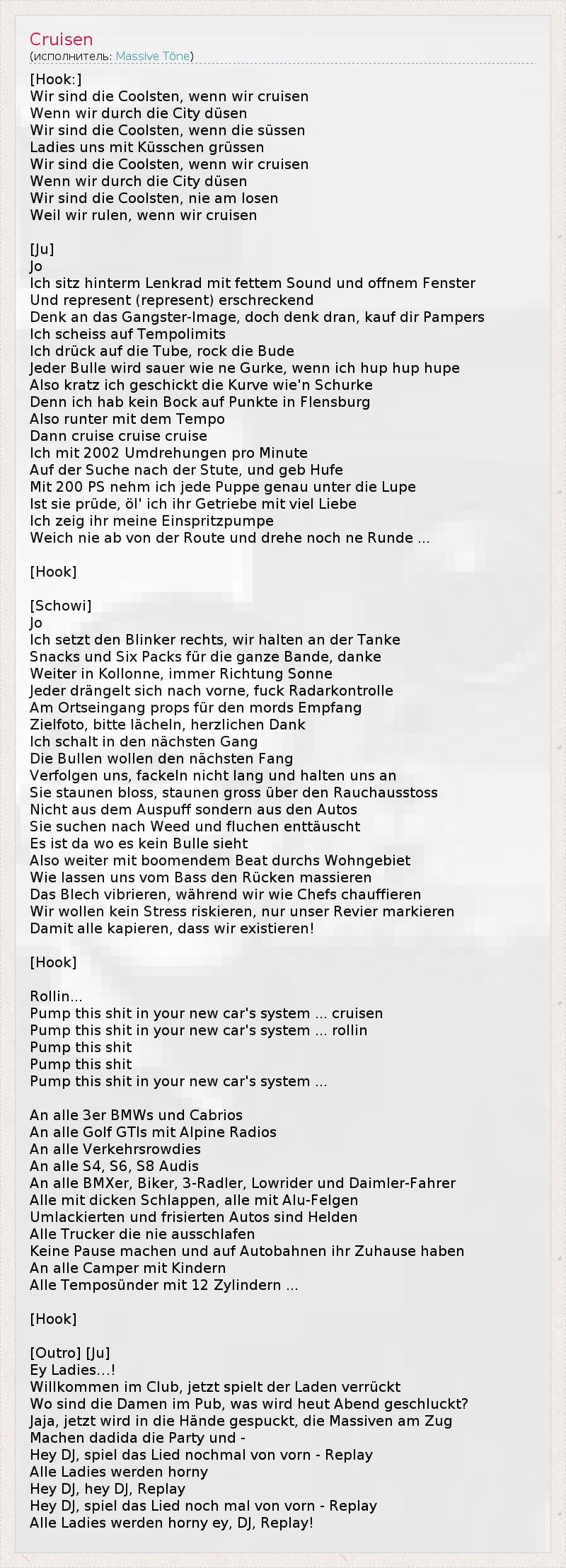 [Hook:] Wir sind die Coolsten, wenn wir cruisen Wenn wir durch die City düsen Wir sind die Coolsten, wenn die süssen Ladies uns mit Küsschen grüssen Wir sind die Coolsten, wenn wir cruisen Wenn wir durch die City düsen Wir sind die Coolsten, nie am losen Weil wir rulen, wenn wir cruisen [Ju] Jo Ich sitz hinterm Lenkrad mit fettem Sound und offnem Fenster Und represent (represent) erschreckend Denk an das Gangster-Image, doch denk dran, kauf dir Pampers Ich scheiss auf Tempolimits Ich drück auf die Tube, rock die Bude Jeder Bulle wird sauer wie ne Gurke, wenn ich hup hup hupe Also kratz ich geschickt die Kurve wie'n Schurke Denn ich hab kein Bock auf Punkte in Flensburg Also runter mit dem Tempo Dann cruise cruise cruise Ich mit 2002 Umdrehungen pro Minute Auf der Suche nach der Stute, und geb Hufe Mit 200 PS nehm ich jede Puppe genau unter die Lupe Ist sie prüde, öl' ich ihr Getriebe mit viel Liebe Ich zeig ihr meine Einspritzpumpe Weich nie ab von der Route und drehe noch ne Runde ... [Hook] [Schowi] Jo Ich setzt den Blinker rechts, wir halten an der Tanke Snacks und Six Packs für die ganze Bande, danke Weiter in Kollonne, immer Richtung Sonne Jeder drängelt sich nach vorne, fuck Radarkontrolle Am Ortseingang props für den mords Empfang Zielfoto, bitte lächeln, herzlichen Dank Ich schalt in den nächsten Gang Die Bullen wollen den nächsten Fang Verfolgen uns, fackeln nicht lang und halten uns an Sie staunen bloss, staunen gross über den Rauchausstoss Nicht aus dem Auspuff sondern aus den Autos Sie suchen nach Weed und fluchen enttäuscht Es ist da wo es kein Bulle sieht Also weiter mit boomendem Beat durchs Wohngebiet Wie lassen uns vom Bass den Rücken massieren Das Blech vibrieren, während wir wie Chefs chauffieren Wir wollen kein Stress riskieren, nur unser Revier markieren Damit alle kapieren, dass wir existieren! [Hook] Rollin... Pump this shit in your new car's system ... cruisen Pump this shit in your new car's system ... rollin Pump this shit Pump this shit Pump this shit in your new car's system ... An alle 3er BMWs und Cabrios An alle Golf GTIs mit Alpine Radios An alle Verkehrsrowdies An alle S4, S6, S8 Audis An alle BMXer, Biker, 3-Radler, Lowrider und Daimler-Fahrer Alle mit dicken Schlappen, alle mit Alu-Felgen Umlackierten und frisierten Autos sind Helden Alle Trucker die nie ausschlafen Keine Pause machen und auf Autobahnen ihr Zuhause haben An alle Camper mit Kindern Alle Temposünder mit 12 Zylindern ... [Hook] [Outro] [Ju] Ey Ladies…! Willkommen im Club, jetzt spielt der Laden verrückt Wo sind die Damen im Pub, was wird heut Abend geschluckt? Jaja, jetzt wird in die Hände gespuckt, die Massiven am Zug Machen dadida die Party und - Hey DJ, spiel das Lied nochmal von vorn - Replay Alle Ladies werden horny Hey DJ, hey DJ, Replay Hey DJ, spiel das Lied noch mal von vorn - Replay Alle Ladies werden horny ey, DJ, Replay!