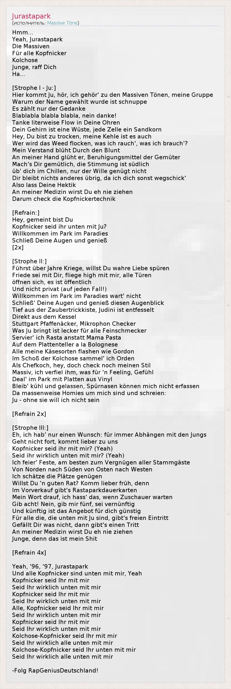 Hmm... Yeah, Jurastapark Die Massiven Für alle Kopfnicker Kolchose Junge, raff Dich Ha... [Strophe I - Ju:] Hier kommt Ju, hör, ich gehör' zu den Massiven Tönen, meine Gruppe Warum der Name gewählt wurde ist schnuppe Es zählt nur der Gedanke Blablabla blabla blabla, nein danke! Tanke literweise Flow in Deine Ohren Dein Gehirn ist eine Wüste, jede Zelle ein Sandkorn Hey, Du bist zu trocken, meine Kehle ist es auch Wer wird das Weed flocken, was ich rauch', was ich brauch'? Mein Verstand blüht Durch den Blunt An meiner Hand glüht er, Beruhigungsmittel der Gemüter Mach's Dir gemütlich, die Stimmung ist südlich üb' dich im Chillen, nur der Wille genügt nicht Dir bleibt nichts anderes übrig, da ich dich sonst wegschick' Also lass Deine Hektik An meiner Medizin wirst Du eh nie ziehen Darum check die Kopfnickertechnik [Refrain:] Hey, gemeint bist Du Kopfnicker seid ihr unten mit Ju? Willkommen im Park im Paradies Schließ Deine Augen und genieß [2x] [Strophe II:] Führst über Jahre Kriege, willst Du wahre Liebe spüren Friede sei mit Dir, fliege high mit mir, alle Türen öffnen sich, es ist öffentlich Und nicht privat (auf jeden Fall!) Willkommen im Park im Paradies wart' nicht Schließ' Deine Augen und genieß diesen Augenblick Tief aus der Zaubertrickkiste, Judini ist entfesselt Direkt aus dem Kessel Stuttgart Pfaffenäcker, Mikrophon Checker Was Ju bringt ist lecker für alle Feinschmecker Servier' ich Rasta anstatt Mama Pasta Auf dem Plattenteller a la Bolognese Alle meine Käsesorten flashen wie Gordon Im Schoß der Kolchose sammel' ich Orden Als Chefkoch, hey, doch check noch meinen Stil Massiv, ich verfiel ihm, was für 'n Feeling, Gefühl Deal' im Park mit Platten aus Vinyl Bleib' kühl und gelassen, Spürnasen können mich nicht erfassen Da massenweise Homies um mich sind und schreien: Ju - ohne sie will ich nicht sein [Refrain 2x] [Strophe III:] Eh, ich hab' nur einen Wunsch: für immer Abhängen mit den Jungs Geht nicht fort, kommt lieber zu uns Kopfnicker seid ihr mit mir? (Yeah) Seid ihr wirklich unten mit mir? (Yeah) Ich feier' Feste, am besten zum Vergnügen aller Stammgäste Von Norden nach Süden von Osten nach Westen Ich schätze die Plätze genügen Willst Du 'n guten Rat? Komm lieber früh, denn Im Vorverkauf gibt's Rastaparkdauerkarten Mein Wort drauf, ich hass' das, wenn Zuschauer warten Gib acht! Nein, gib mir fünf, sei vernünftig Und künftig ist das Angebot für dich günstig Für alle die, die unten mit Ju sind, gibt's freien Eintritt Gefällt Dir was nicht, dann gibt's einen Tritt An meiner Medizin wirst Du eh nie ziehen Junge, denn das ist mein Shit [Refrain 4x] Yeah, '96, '97, Jurastapark Und alle Kopfnicker sind unten mit mir, Yeah Kopfnicker seid Ihr mit mir Seid Ihr wirklich unten mit mir Kopfnicker seid Ihr mit mir Seid Ihr wirklich unten mit mir Alle, Kopfnicker seid Ihr mit mir Seid Ihr wirklich unten mit mir Kopfnicker seid Ihr mit mir Seid Ihr wirklich unten mit mir Kolchose-Kopfnicker seid Ihr mit mir Seid Ihr wirklich alle unten mit mir Kolchose-Kopfnicker seid Ihr unten mit mir Seid Ihr wirklich alle unten mit mir -Folg RapGeniusDeutschland!