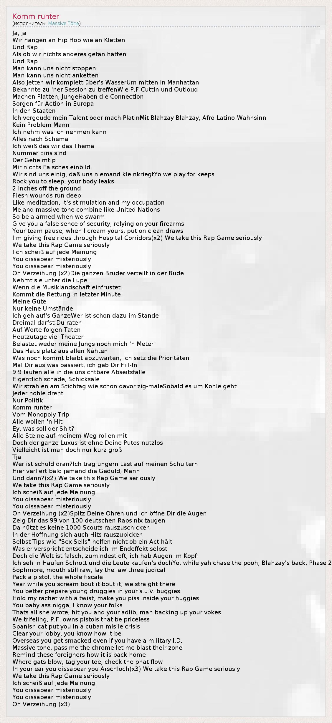 Ja, ja Wir hängen an Hip Hop wie an Kletten Und Rap Als ob wir nichts anderes getan hätten Und Rap Man kann uns nicht stoppen Man kann uns nicht anketten Also jetten wir komplett über's WasserUm mitten in Manhattan Bekannte zu 'ner Session zu treffenWie P.F.Cuttin und Outloud Machen Platten, JungeHaben die Connection Sorgen für Action in Europa In den Staaten Ich vergeude mein Talent oder mach PlatinMit Blahzay Blahzay, Afro-Latino-Wahnsinn Kein Problem Mann Ich nehm was ich nehmen kann Alles nach Schema Ich weiß das wir das Thema Nummer Eins sind Der Geheimtip Mir nichts Falsches einbild Wir sind uns einig, daß uns niemand kleinkriegtYo we play for keeps Rock you to sleep, your body leaks 2 inches off the ground Flesh wounds run deep Like meditation, it's stimulation and my occupation Me and massive tone combine like United Nations So be alarmed when we swarm Give you a false sence of security, relying on your firearms Your team pause, when I cream yours, put on clean draws I'm giving free rides through Hospital Corridors(x2) We take this Rap Game seriously We take this Rap Game seriously Iich scheiß auf jede Meinung You dissapear misteriously You dissapear misteriously Oh Verzeihung (x2)Die ganzen Brüder verteilt in der Bude Nehmt sie unter die Lupe Wenn die Musiklandschaft einfrustet Kommt die Rettung in letzter Minute Meine Güte Nur keine Umstände Ich geh auf's GanzeWer ist schon dazu im Stande Dreimal darfst Du raten Auf Worte folgen Taten Heutzutage viel Theater Belastet weder meine Jungs noch mich 'n Meter Das Haus platz aus allen Nähten Was noch kommt bleibt abzuwarten, ich setz die Prioritäten Mal Dir aus was passiert, ich geb Dir Fill-In 9 9 laufen alle in die unsichtbare Abseitsfalle Eigentlich schade, Schicksale Wir strahlen am Stichtag wie schon davor zig-maleSobald es um Kohle geht Jeder hohle dreht Nur Politik Komm runter Vom Monopoly Trip Alle wollen 'n Hit Ey, was soll der Shit? Alle Steine auf meinem Weg rollen mit Doch der ganze Luxus ist ohne Deine Putos nutzlos Vielleicht ist man doch nur kurz groß Tja Wer ist schuld dran?Ich trag ungern Last auf meinen Schultern Hier verliert bald jemand die Geduld, Mann Und dann?(x2) We take this Rap Game seriously We take this Rap Game seriously Ich scheiß auf jede Meinung You dissapear misteriously You dissapear misteriously Oh Verzeihung (x2)Spitz Deine Ohren und ich öffne Dir die Augen Zeig Dir das 99 von 100 deutschen Raps nix taugen Da nützt es keine 1000 Scouts rauszuschicken In der Hoffnung sich auch Hits rauszupicken Selbst Tips wie "Sex Sells" helfen nicht ob ein Act hält Was er verspricht entscheide ich im Endeffekt selbst Doch die Welt ist falsch, zumindest oft, ich hab Augen im Kopf Ich seh 'n Haufen Schrott und die Leute kaufen's dochYo, while yah chase the pooh, Blahzay's back, Phase 2 Sophmore, mouth still raw, lay the law three judical Pack a pistol, the whole fiscale Year while you scream bout it bout it, we straight there You better prepare young druggies in your s.u.v. buggies Hold my rachet with a twist, make you piss inside your huggies You baby ass nigga, I know your folks Thats all she wrote, hit you and your adlib, man backing up your vokes We trifeling, P.F. owns pistols that be priceless Spanish cat put you in a cuban misile crisis Clear your lobby, you know how it be Overseas you get smacked even if you have a military I.D. Massive tone, pass me the chrome let me blast their zone Remind these foreigners how it is back home Where gats blow, tag your toe, check the phat flow In your ear you dissapear you Arschloch(x3) We take this Rap Game seriously We take this Rap Game seriously Ich scheiß auf jede Meinung You dissapear misteriously You dissapear misteriously Oh Verzeihung (x3)