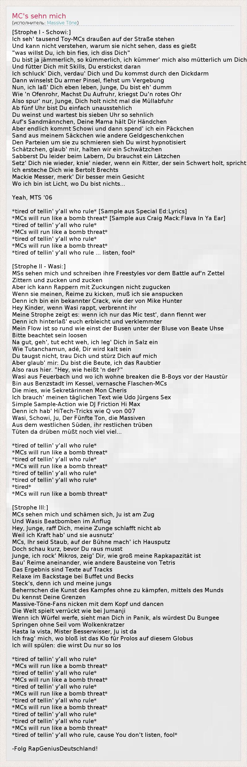 [Strophe I - Schowi:] Ich seh' tausend Toy-MCs draußen auf der Straße stehen Und kann nicht verstehen, warum sie nicht sehen, dass es gießt "was willst Du, ich bin fies, ich diss Dich" Du bist ja jämmerlich, so kümmerlich, ich kümmer' mich also mütterlich um Dich Und fütter Dich mit Skills, Du erstickst daran Ich schluck' Dich, verdau' Dich und Du kommst durch den Dickdarm Dann winselst Du armer Pinsel, flehst um Vergebung Nun, ich laß' Dich eben leben, Junge, Du bist eh' dumm Wie 'n Ofenrohr, Machst Du Aufruhr, kriegst Du'n rotes Ohr Also spur' nur, Junge, Dich holt nicht mal die Müllabfuhr Ab fünf Uhr bist Du einfach unausstehlich Du weinst und wartest bis sieben Uhr so sehnlich Auf's Sandmännchen, Deine Mama hält Dir Händchen Aber endlich kommt Schowi und dann spend' ich ein Päckchen Sand aus meinem Säckchen wie andere Geldgeschenkchen Den Parteien um sie zu schmieren sieh Du wirst hypnotisiert Schätzchen, glaub' mir, halten wir ein Schwätzchen Sabberst Du leider beim Labern, Du brauchst ein Lätzchen Setz' Dich nie wieder, knie' nieder, wenn ein Ritter, der sein Schwert holt, spricht Ich ersteche Dich wie Bertolt Brechts Mackie Messer, merk' Dir besser mein Gesicht Wo ich bin ist Licht, wo Du bist nichts... Yeah, MTS '06 *tired of tellin' y'all who rule* [Sample aus Special Ed:Lyrics] *MCs will run like a bomb threat* [Sample aus Craig Mack:Flava In Ya Ear] *tired of tellin' y'all who rule* *MCs will run like a bomb threat* *tired of tellin' y'all who rule* *MCs will run like a bomb threat* *tired of tellin' y'all who rule ... listen, fool* [Strophe II - Wasi:] MSs sehen mich und schreiben ihre Freestyles vor dem Battle auf'n Zettel Zittern und zucken und zucken Aber ich kann Rappern mit Zuckungen nicht zugucken Wenn sie meinen, Reime zu kicken, muß ich sie anspucken Denn ich bin ein bekannter Crack, wie der von Mike Hunter Hey Kinder, wenn Wasi rappt, verbrennt ihr Meine Strophe zeigt es: wenn ich nur das Mic test', dann flennt wer Denn ich hinterlaß' euch erbleicht und verklemmter Mein Flow ist so rund wie einst der Busen unter der Bluse von Beate Uhse Bitte beachtet sein loosen Na gut, geh', tut echt weh, ich leg' Dich in Salz ein Wie Tutanchamun, adé, Dir wird kalt sein Du taugst nicht, trau Dich und stürz Dich auf mich Aber glaub' mir: Du bist die Beute, ich das Raubtier Also raus hier. "Hey, wie heißt 'n der?" Wasi aus Feuerbach und wo ich wohne breaken die B-Boys vor der Haustür Bin aus Benzstadt im Kessel, vernasche Flaschen-MCs Die mies, wie Sekretärinnen Mon Cheris Ich brauch' meinen täglichen Text wie Udo Jürgens Sex Simple Sample-Action wie DJ Friction Hi Max Denn ich hab' HiTech-Tricks wie Q von 007 Wasi, Schowi, Ju, Der Fünfte Ton, die Massiven Aus dem westlichen Süden, ihr restlichen trüben Tüten da drüben müßt noch viel viel... *tired of tellin' y'all who rule* *MCs will run like a bomb threat* *tired of tellin' y'all who rule* *MCs will run like a bomb threat* *tired of tellin' y'all who rule* *tired of tellin' y'all who rule* *tired* *MCs will run like a bomb threat* [Strophe III:] MCs sehen mich und schämen sich, Ju ist am Zug Und Wasis Beatbomben im Anflug Hey, Junge, raff Dich, meine Zunge schlafft nicht ab Weil ich Kraft hab' und sie ausnutz' MCs, Ihr seid Staub, auf der Bühne mach' ich Hausputz Doch schau kurz, bevor Du raus musst Junge, ich rock' Mikros, zeig' Dir, wie groß meine Rapkapazität ist Bau' Reime aneinander, wie andere Bausteine von Tetris Das Ergebnis sind Texte auf Tracks Relaxe im Backstage bei Buffet und Becks Steck's, denn ich und meine jungs Beherrschen die Kunst des Kampfes ohne zu kämpfen, mittels des Munds Du kennst Deine Grenzen Massive-Töne-Fans nicken mit dem Kopf und dancen Die Welt spielt verrückt wie bei Jumanji Wenn ich Würfel werfe, sieht man Dich in Panik, als würdest Du Bungee Springen ohne Seil vom Wolkenkratzer Hasta la vista, Mister Besserwisser, Ju ist da Ich frag' mich, wo bloß ist das Klo für Prolos auf diesem Globus Ich will spülen: die wirst Du nur so los *tired of tellin' y'all who rule* *MCs will run like a bomb threat* *tired of tellin' y'all who rule* *MCs will run like a bomb threat* *tired of tellin' y'all who rule* *MCs will run like a bomb threat* *tired of tellin' y'all who rule* *MCs will run like a bomb threat* *tired of tellin' y'all who rule* *tired of tellin' y'all who rule* *MCs will run like a bomb threat* *tired of tellin' y'all who rule, cause You don't listen, fool* -Folg RapGeniusDeutschland!