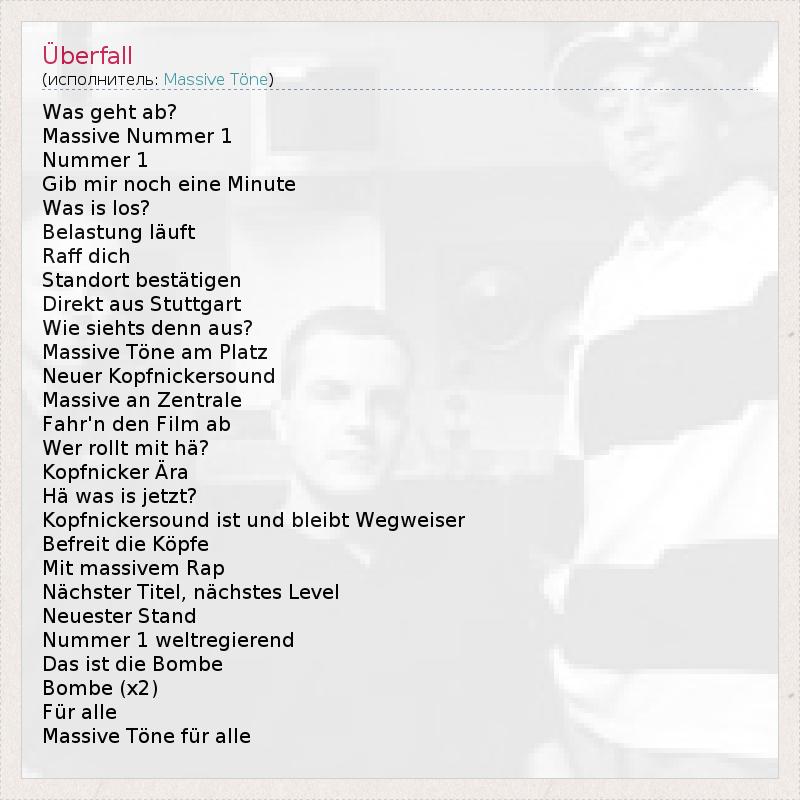 Was geht ab? Massive Nummer 1 Nummer 1 Gib mir noch eine Minute Was is los? Belastung läuft Raff dich Standort bestätigen Direkt aus Stuttgart Wie siehts denn aus? Massive Töne am Platz Neuer Kopfnickersound Massive an Zentrale Fahr'n den Film ab Wer rollt mit hä? Kopfnicker Ära Hä was is jetzt? Kopfnickersound ist und bleibt Wegweiser Befreit die Köpfe Mit massivem Rap Nächster Titel, nächstes Level Neuester Stand Nummer 1 weltregierend Das ist die Bombe Bombe (x2) Für alle Massive Töne für alle