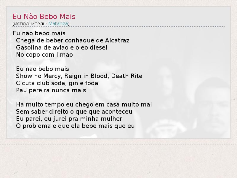 Eu nao bebo mais Chega de beber conhaque de Alcatraz Gasolina de aviao e oleo diesel No copo com limao Eu nao bebo mais Show no Mercy, Reign in Blood, Death Rite Cicuta club soda, gin e foda Pau pereira nunca mais Ha muito tempo eu chego em casa muito mal Sem saber direito o que que aconteceu Eu parei, eu jurei pra minha mulher O problema e que ela bebe mais que eu