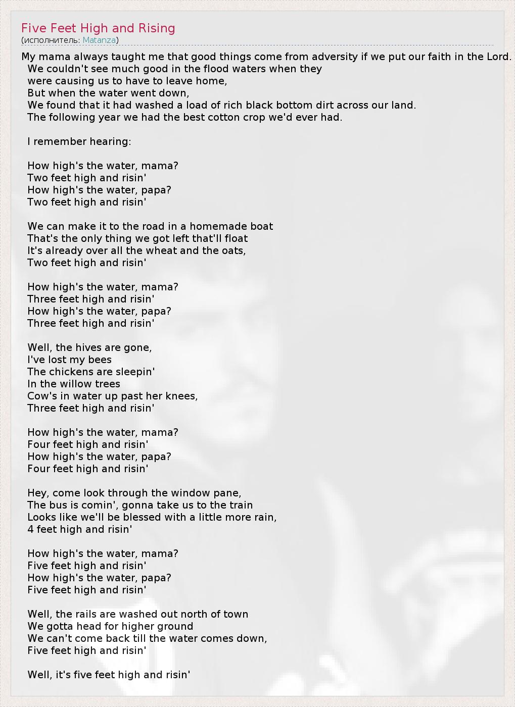 My mama always taught me that good things come from adversity if we put our faith in the Lord. We couldn't see much good in the flood waters when they were causing us to have to leave home, But when the water went down, We found that it had washed a load of rich black bottom dirt across our land. The following year we had the best cotton crop we'd ever had. I remember hearing: How high's the water, mama? Two feet high and risin' How high's the water, papa? Two feet high and risin' We can make it to the road in a homemade boat That's the only thing we got left that'll float It's already over all the wheat and the oats, Two feet high and risin' How high's the water, mama? Three feet high and risin' How high's the water, papa? Three feet high and risin' Well, the hives are gone, I've lost my bees The chickens are sleepin' In the willow trees Cow's in water up past her knees, Three feet high and risin' How high's the water, mama? Four feet high and risin' How high's the water, papa? Four feet high and risin' Hey, come look through the window pane, The bus is comin', gonna take us to the train Looks like we'll be blessed with a little more rain, 4 feet high and risin' How high's the water, mama? Five feet high and risin' How high's the water, papa? Five feet high and risin' Well, the rails are washed out north of town We gotta head for higher ground We can't come back till the water comes down, Five feet high and risin' Well, it's five feet high and risin'