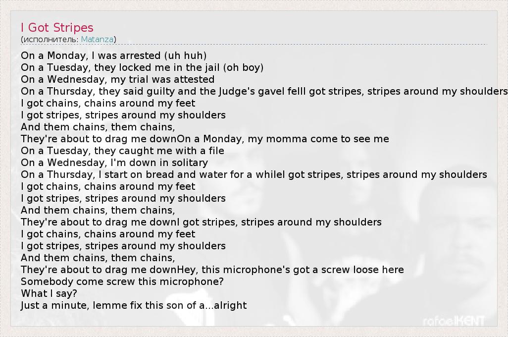 On a Monday, I was arrested (uh huh) On a Tuesday, they locked me in the jail (oh boy) On a Wednesday, my trial was attested On a Thursday, they said guilty and the Judge's gavel fellI got stripes, stripes around my shoulders I got chains, chains around my feet I got stripes, stripes around my shoulders And them chains, them chains, They're about to drag me downOn a Monday, my momma come to see me On a Tuesday, they caught me with a file On a Wednesday, I'm down in solitary On a Thursday, I start on bread and water for a whileI got stripes, stripes around my shoulders I got chains, chains around my feet I got stripes, stripes around my shoulders And them chains, them chains, They're about to drag me downI got stripes, stripes around my shoulders I got chains, chains around my feet I got stripes, stripes around my shoulders And them chains, them chains, They're about to drag me downHey, this microphone's got a screw loose here Somebody come screw this microphone? What I say? Just a minute, lemme fix this son of a...alright