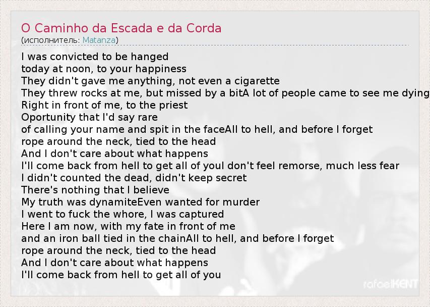 I was convicted to be hanged today at noon, to your happiness They didn't gave me anything, not even a cigarette They threw rocks at me, but missed by a bitA lot of people came to see me dying Right in front of me, to the priest Oportunity that I'd say rare of calling your name and spit in the faceAll to hell, and before I forget rope around the neck, tied to the head And I don't care about what happens I'll come back from hell to get all of youI don't feel remorse, much less fear I didn't counted the dead, didn't keep secret There's nothing that I believe My truth was dynamiteEven wanted for murder I went to fuck the whore, I was captured Here I am now, with my fate in front of me and an iron ball tied in the chainAll to hell, and before I forget rope around the neck, tied to the head And I don't care about what happens I'll come back from hell to get all of you