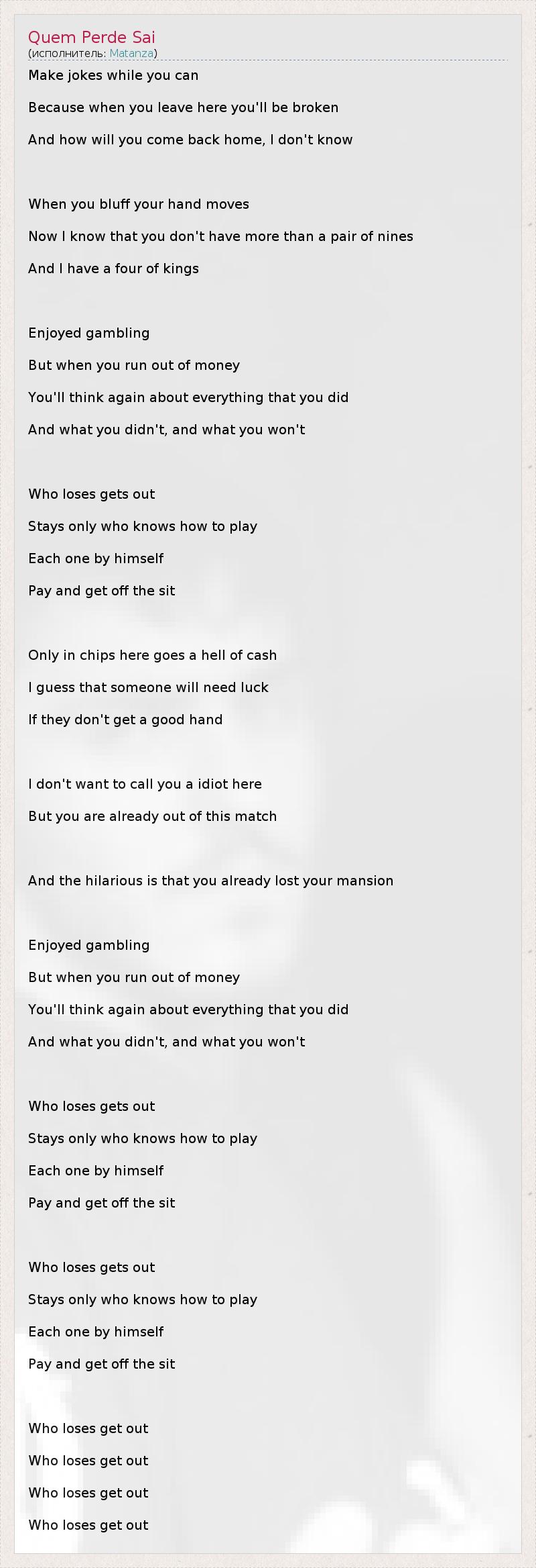 Make jokes while you can Because when you leave here you'll be broken And how will you come back home, I don't know When you bluff your hand moves Now I know that you don't have more than a pair of nines And I have a four of kings Enjoyed gambling But when you run out of money You'll think again about everything that you did And what you didn't, and what you won't Who loses gets out Stays only who knows how to play Each one by himself Pay and get off the sit Only in chips here goes a hell of cash I guess that someone will need luck If they don't get a good hand I don't want to call you a idiot here But you are already out of this match And the hilarious is that you already lost your mansion Enjoyed gambling But when you run out of money You'll think again about everything that you did And what you didn't, and what you won't Who loses gets out Stays only who knows how to play Each one by himself Pay and get off the sit Who loses gets out Stays only who knows how to play Each one by himself Pay and get off the sit Who loses get out Who loses get out Who loses get out Who loses get out