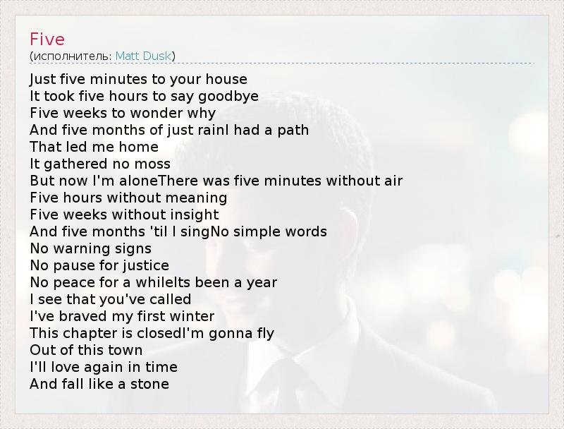 Just five minutes to your house It took five hours to say goodbye Five weeks to wonder why And five months of just rainI had a path That led me home It gathered no moss But now I'm aloneThere was five minutes without air Five hours without meaning Five weeks without insight And five months 'til I singNo simple words No warning signs No pause for justice No peace for a whileIts been a year I see that you've called I've braved my first winter This chapter is closedI'm gonna fly Out of this town I'll love again in time And fall like a stone