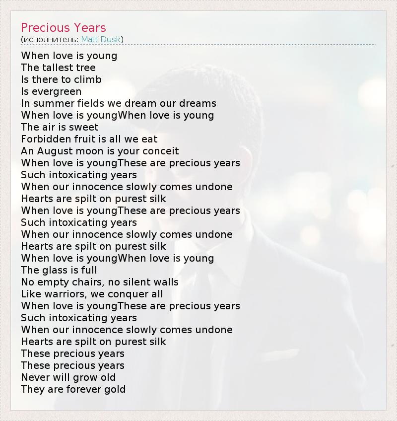 When love is young The tallest tree Is there to climb Is evergreen In summer fields we dream our dreams When love is youngWhen love is young The air is sweet Forbidden fruit is all we eat An August moon is your conceit When love is youngThese are precious years Such intoxicating years When our innocence slowly comes undone Hearts are spilt on purest silk When love is youngThese are precious years Such intoxicating years When our innocence slowly comes undone Hearts are spilt on purest silk When love is youngWhen love is young The glass is full No empty chairs, no silent walls Like warriors, we conquer all When love is youngThese are precious years Such intoxicating years When our innocence slowly comes undone Hearts are spilt on purest silk These precious years These precious years Never will grow old They are forever gold