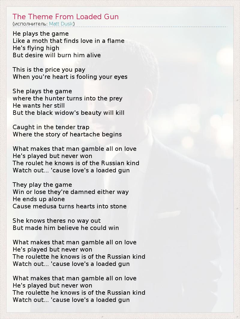 He plays the game Like a moth that finds love in a flame He's flying high But desire will burn him alive This is the price you pay When you're heart is fooling your eyes She plays the game where the hunter turns into the prey He wants her still But the black widow's beauty will kill Caught in the tender trap Where the story of heartache begins What makes that man gamble all on love He's played but never won The roulet he knows is of the Russian kind Watch out... 'cause love's a loaded gun They play the game Win or lose they're damned either way He ends up alone Cause medusa turns hearts into stone She knows theres no way out But made him believe he could win What makes that man gamble all on love He's played but never won The roulette he knows is of the Russian kind Watch out... 'cause love's a loaded gun What makes that man gamble all on love He's played but never won The roulette he knows is of the Russian kind Watch out... 'cause love's a loaded gun