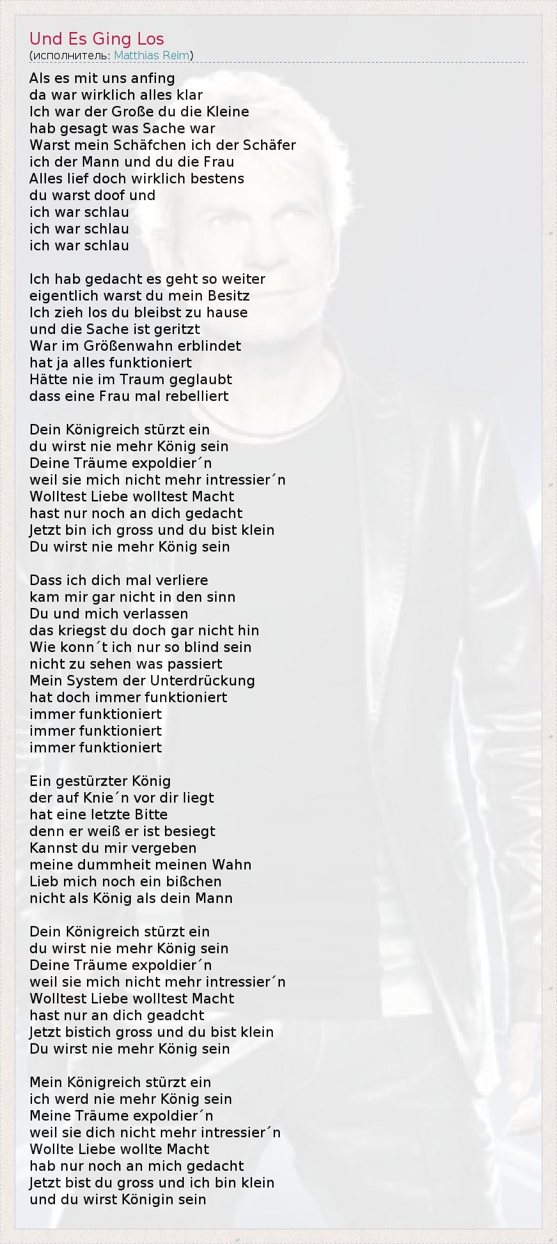 Als es mit uns anfing da war wirklich alles klar Ich war der Große du die Kleine hab gesagt was Sache war Warst mein Schäfchen ich der Schäfer ich der Mann und du die Frau Alles lief doch wirklich bestens du warst doof und ich war schlau ich war schlau ich war schlau Ich hab gedacht es geht so weiter eigentlich warst du mein Besitz Ich zieh los du bleibst zu hause und die Sache ist geritzt War im Größenwahn erblindet hat ja alles funktioniert Hätte nie im Traum geglaubt dass eine Frau mal rebelliert Dein Königreich stürzt ein du wirst nie mehr König sein Deine Träume expoldier´n weil sie mich nicht mehr intressier´n Wolltest Liebe wolltest Macht hast nur noch an dich gedacht Jetzt bin ich gross und du bist klein Du wirst nie mehr König sein Dass ich dich mal verliere kam mir gar nicht in den sinn Du und mich verlassen das kriegst du doch gar nicht hin Wie konn´t ich nur so blind sein nicht zu sehen was passiert Mein System der Unterdrückung hat doch immer funktioniert immer funktioniert immer funktioniert immer funktioniert Ein gestürzter König der auf Knie´n vor dir liegt hat eine letzte Bitte denn er weiß er ist besiegt Kannst du mir vergeben meine dummheit meinen Wahn Lieb mich noch ein bißchen nicht als König als dein Mann Dein Königreich stürzt ein du wirst nie mehr König sein Deine Träume expoldier´n weil sie mich nicht mehr intressier´n Wolltest Liebe wolltest Macht hast nur an dich geadcht Jetzt bistich gross und du bist klein Du wirst nie mehr König sein Mein Königreich stürzt ein ich werd nie mehr König sein Meine Träume expoldier´n weil sie dich nicht mehr intressier´n Wollte Liebe wollte Macht hab nur noch an mich gedacht Jetzt bist du gross und ich bin klein und du wirst Königin sein