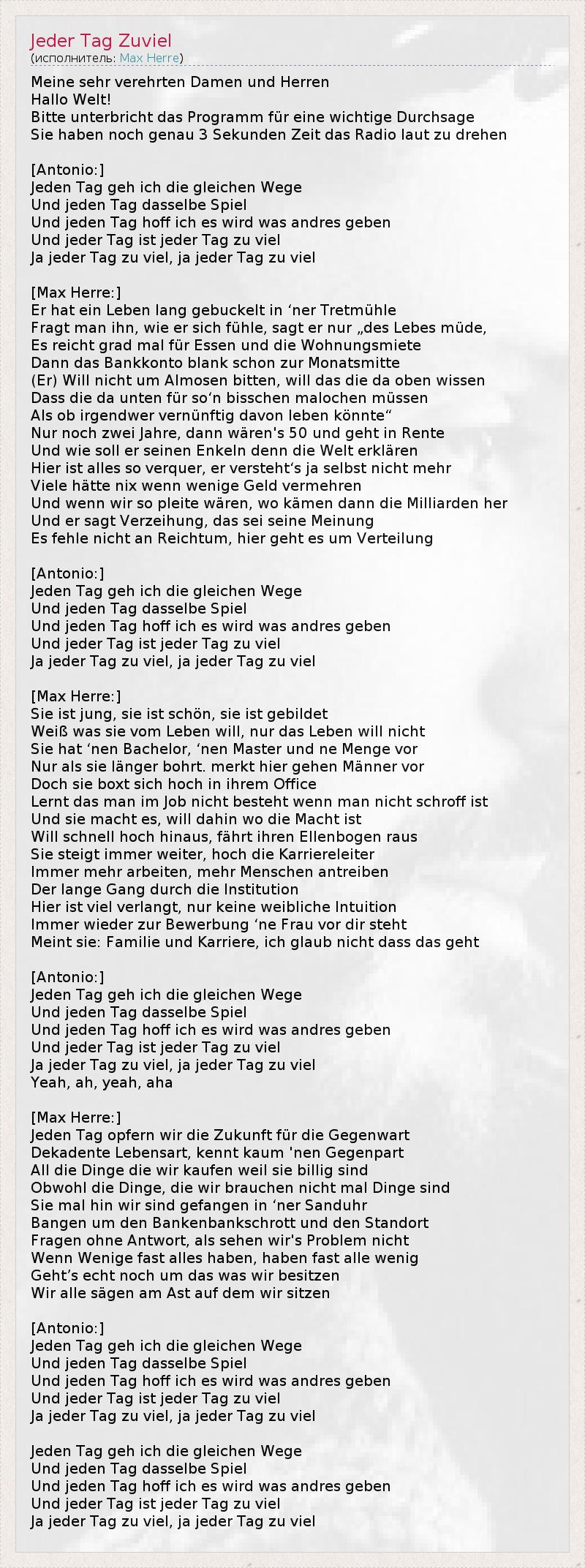 А как ты думаешь, о чем песня "Jeder Tag Zuviel" ?