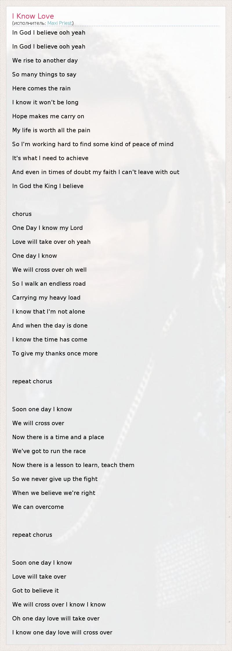 In God I believe ooh yeah In God I believe ooh yeah We rise to another day So many things to say Here comes the rain I know it won't be long Hope makes me carry on My life is worth all the pain So I'm working hard to find some kind of peace of mind It's what I need to achieve And even in times of doubt my faith I can't leave with out In God the King I believe chorus One Day I know my Lord Love will take over oh yeah One day I know We will cross over oh well So I walk an endless road Carrying my heavy load I know that I'm not alone And when the day is done I know the time has come To give my thanks once more repeat chorus Soon one day I know We will cross over Now there is a time and a place We've got to run the race Now there is a lesson to learn, teach them So we never give up the fight When we believe we're right We can overcome repeat chorus Soon one day I know Love will take over Got to believe it We will cross over I know I know Oh one day love will take over I know one day love will cross over