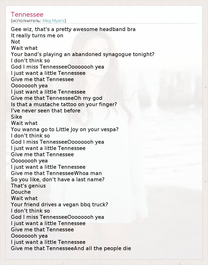 Это интересно:Мэг Майерс - 28-летняя американская вокалистка с интенсивным женским голосом и песнями о любви с грустной, темной лирикой, а также автор песен под продюсерством Doctor Rosen Rosen. Она представляет собой темную сторону Sub Pop. Девушка девяностых, родом из Смоки-Теннесси. На данный момент проживает в Лос-Анджелесе. Является бывшим Свидетелем Иеговы. Мег вдохновил ее брат, увлекающийся Нирваной, Джимми... продолжение
