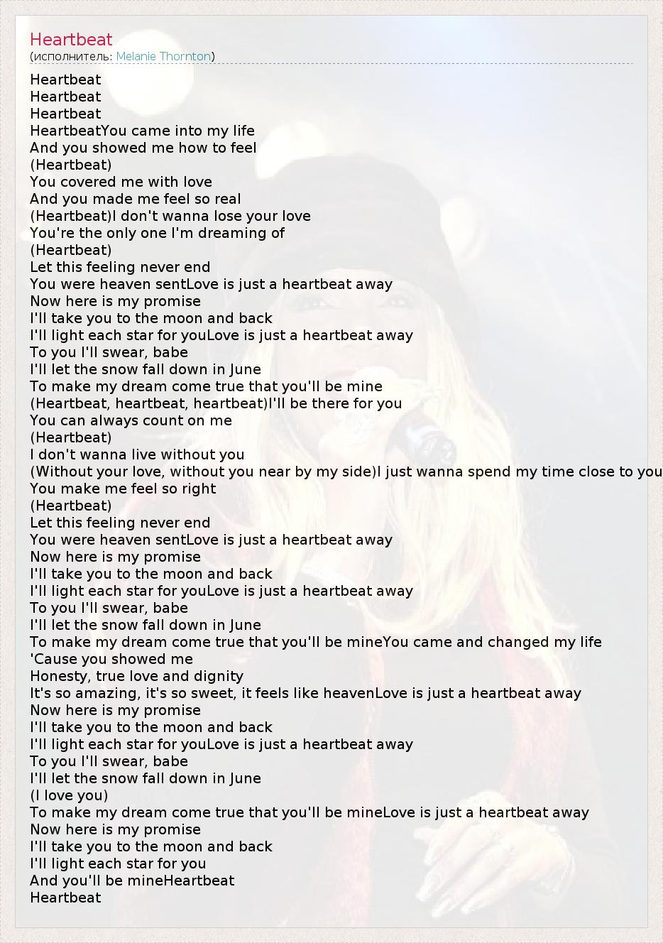 Heartbeat Heartbeat Heartbeat HeartbeatYou came into my life And you showed me how to feel (Heartbeat) You covered me with love And you made me feel so real (Heartbeat)I don't wanna lose your love You're the only one I'm dreaming of (Heartbeat) Let this feeling never end You were heaven sentLove is just a heartbeat away Now here is my promise I'll take you to the moon and back I'll light each star for youLove is just a heartbeat away To you I'll swear, babe I'll let the snow fall down in June To make my dream come true that you'll be mine (Heartbeat, heartbeat, heartbeat)I'll be there for you You can always count on me (Heartbeat) I don't wanna live without you (Without your love, without you near by my side)I just wanna spend my time close to you You make me feel so right (Heartbeat) Let this feeling never end You were heaven sentLove is just a heartbeat away Now here is my promise I'll take you to the moon and back I'll light each star for youLove is just a heartbeat away To you I'll swear, babe I'll let the snow fall down in June To make my dream come true that you'll be mineYou came and changed my life 'Cause you showed me Honesty, true love and dignity It's so amazing, it's so sweet, it feels like heavenLove is just a heartbeat away Now here is my promise I'll take you to the moon and back I'll light each star for youLove is just a heartbeat away To you I'll swear, babe I'll let the snow fall down in June (I love you) To make my dream come true that you'll be mineLove is just a heartbeat away Now here is my promise I'll take you to the moon and back I'll light each star for you And you'll be mineHeartbeat Heartbeat